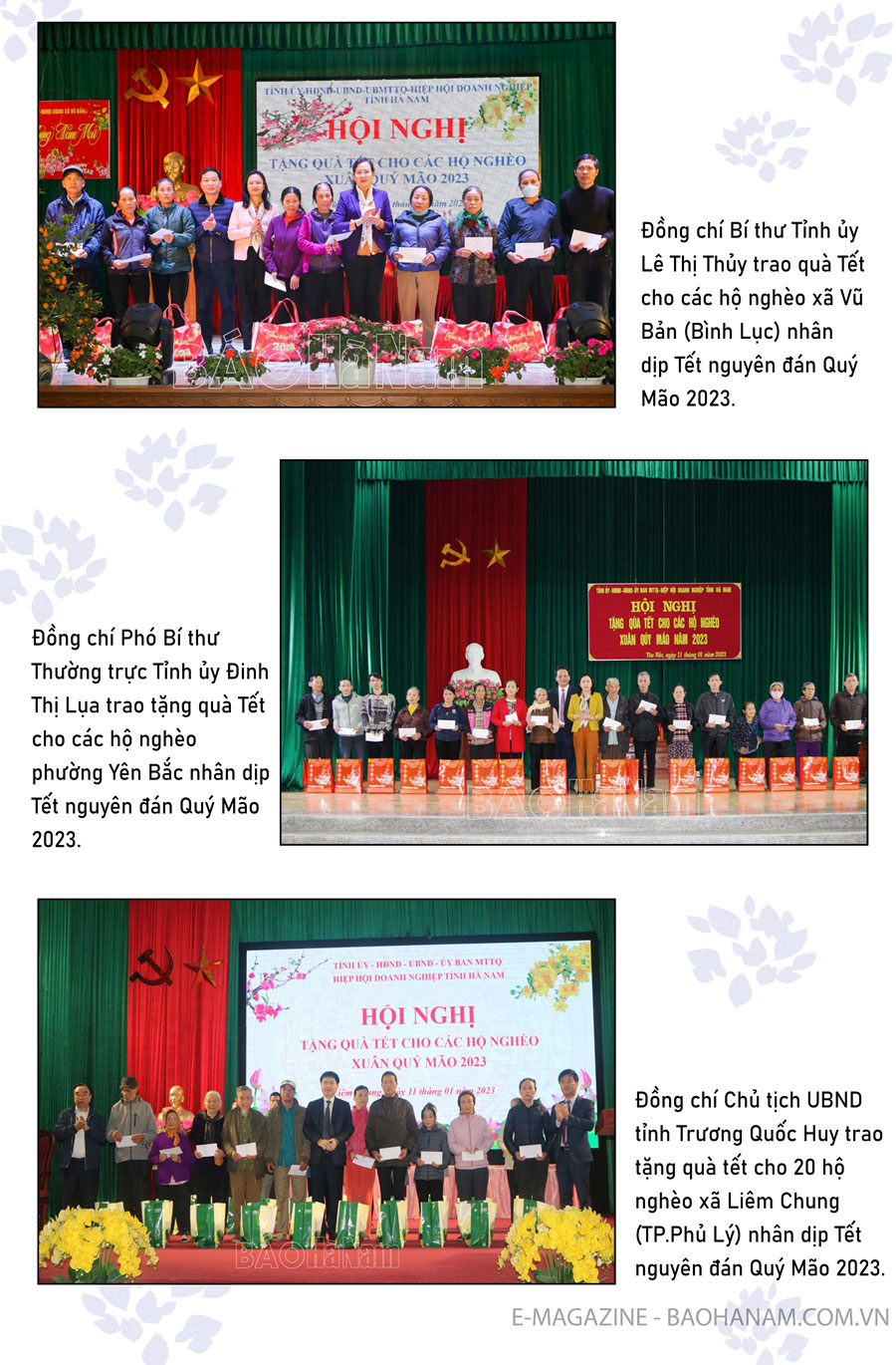 Quan tâm thăm hỏi, tặng quà người có công với cách mạng, hộ nghèo, người cao tuổi...nhân dịp Lễ, Tết (tặng quà 62.910 người có công, 12.464 hộ nghèo; 2.046 trẻ em nghèo, chúc thọ 17.787 người cao tuổi...với tổng số tiền hơn 49 tỷ đồng). Tổ chức Tết sum vầy tại Khu công nghiệp Châu Sơn (Phủ Lý); phiên chợ cho công nhân; hỗ trợ xây dựng 25 Nhà “Đại đoàn kết”. Giải quyết việc làm mới cho hơn 28 nghìn người; tỷ lệ hộ nghèo giảm còn 2,11%; cho vay hỗ trợ tạo việc làm, duy trì và mở rộng việc làm; hỗ trợ vốn tín dụng chính sách để mua, thuê nhà ở xã hội, xây dựng, sửa chữa nhà ở trên địa bàn tỉnh Hà Nam khoảng 30 tỷ đồng. Tích cực thực hiện Chương trình mục tiêu quốc gia giảm nghèo bền vững giai đoạn 2021-2025; tăng cường thực hiện đồng bộ các nhóm giải pháp phát triển đối tượng tham gia bảo hiểm xã hội; ban hành quyết định sửa đổi, bổ sung một số điều của quy định một số nội dung về bồi thường, hỗ trợ và tái định cư khi nhà nước thu hồi đất.
