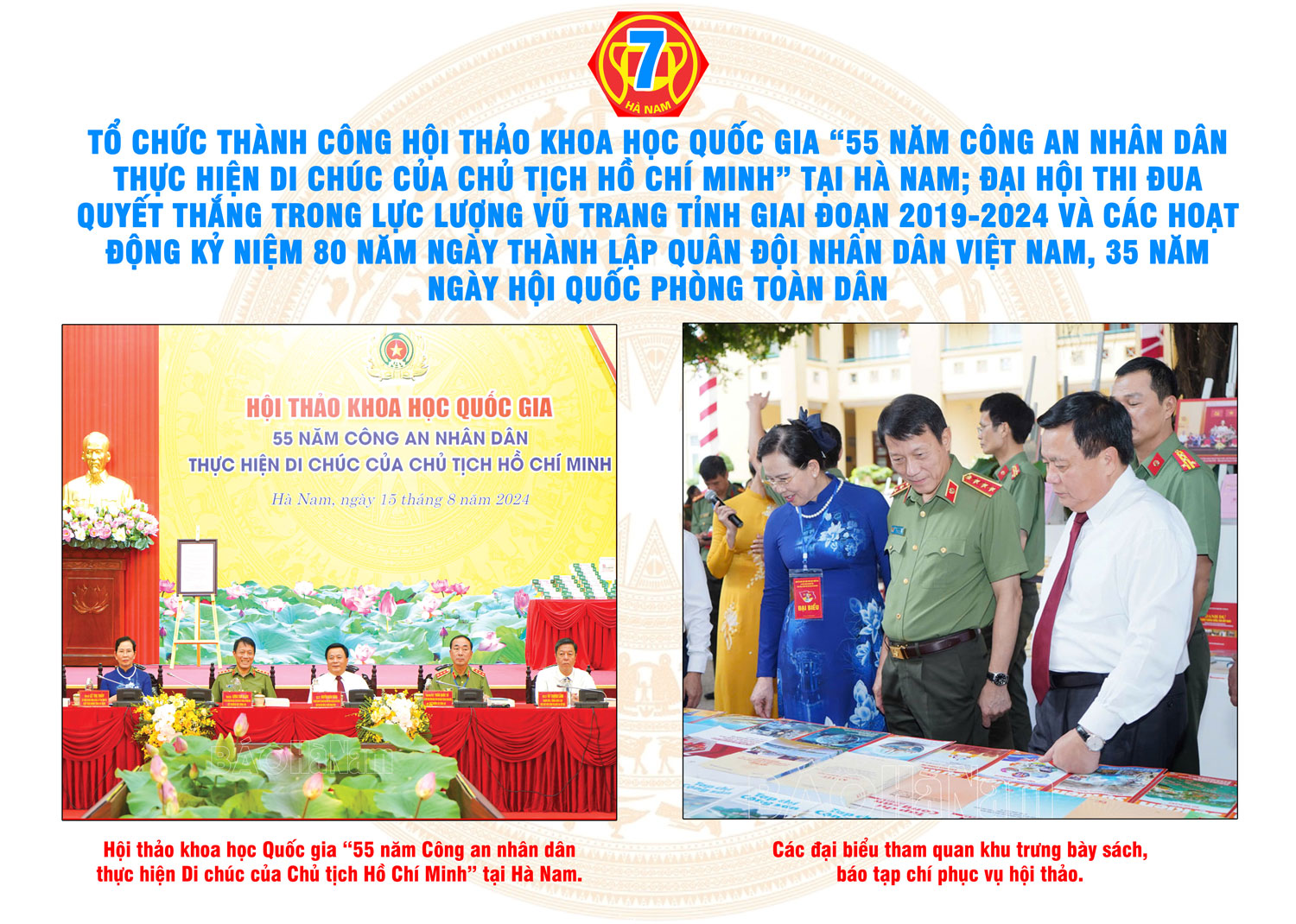 Ngày 15/8/2024, tại tỉnh Hà Nam, Đảng ủy Công an Trung ương, Tỉnh ủy Hà Nam, Nhà xuất bản Chính trị quốc gia Sự thật, Bộ Biên tập Tạp chí Cộng sản phối hợp tổ chức thành công Hội thảo khoa học quốc gia “55 năm Công an nhân dân thực hiện Di chúc của Chủ tịch Hồ Chí Minh". Hội thảo được kết nối trực tuyến đến điểm cầu công an các tỉnh, thành phố trên cả nước. Hội thảo có ý nghĩa quan trọng khẳng định giá trị lý luận, thực tiễn của Di chúc; đánh giá những thành tựu, bài học kinh nghiệm trong 55 năm Công an nhân dân thực hiện Di chúc của Chủ tịch Hồ Chí Minh, góp phần khắc sâu và thực hiện có hiệu quả tư tưởng, đạo đức và phong cách Hồ Chí Minh, xây dựng lực lượng Công an nhân dân thật sự trong sạch, vững mạnh, chính quy, tinh nhuệ, hiện đại, đáp ứng yêu cầu, nhiệm vụ trong tình hình mới. Năm 2024, Công an tỉnh đã đảm bảo giữ vững an ninh chính trị, trật tự an toàn xã hội, không để phát sinh các vụ việc phức tạp, xảy ra “bị động, bất ngờ”. Bảo vệ tuyệt đối an toàn hoạt động của các đồng chí lãnh đạo Đảng, Nhà nước, các sự kiện quan trọng diễn ra trên địa bàn tỉnh, quyết liệt đấu tranh, trấn áp các loại tội phạm, tiếp tục triển khai thực hiện hiệu quả các nhiệm vụ Đề án số 06 của Chính phủ…