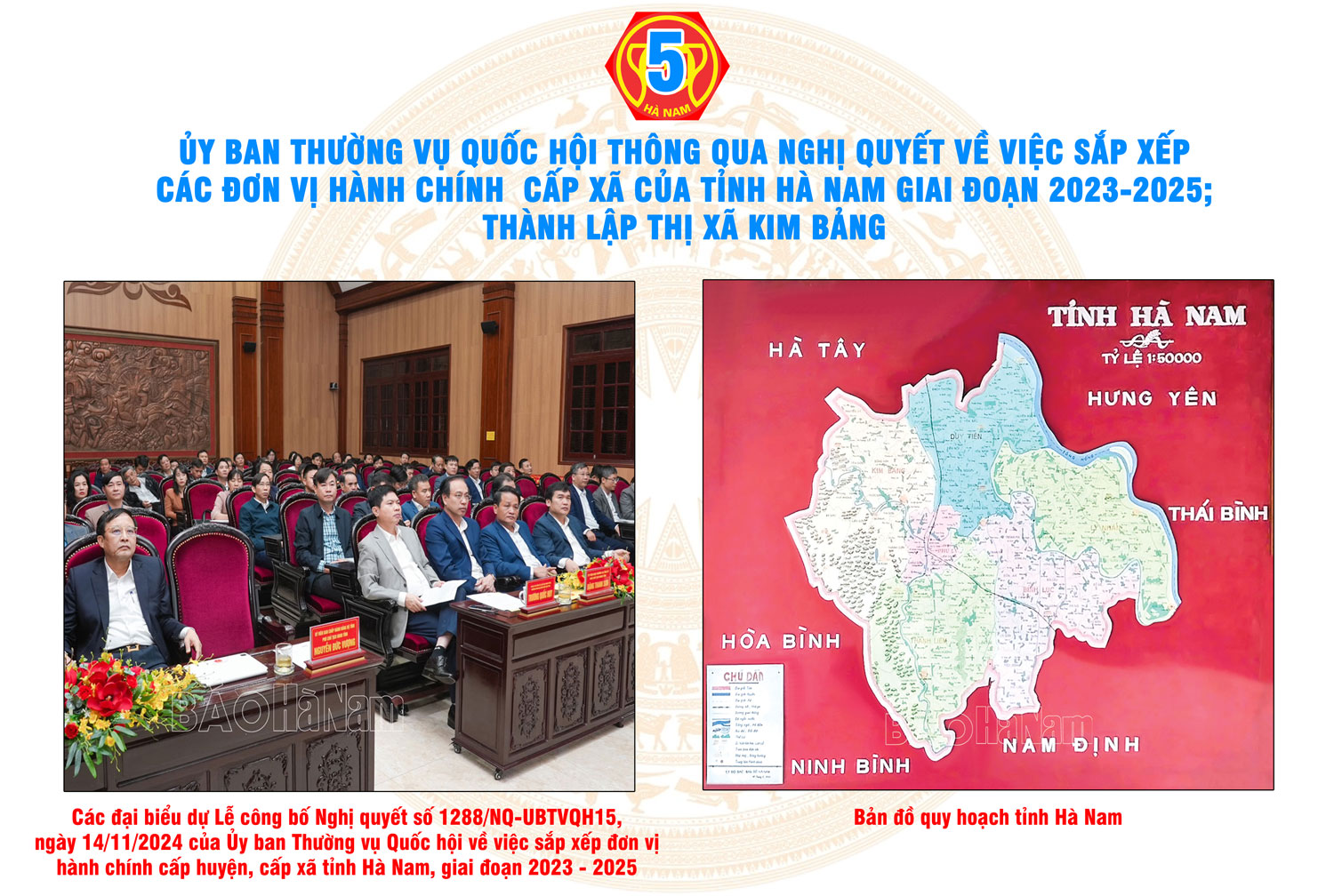Ngày 14/11/2024, Ủy ban Thường vụ Quốc hội thông qua Nghị quyết số 1288/NQ-UBTVQH về việc sắp xếp các đơn vị hành chính cấp huyện, cấp xã tỉnh Hà Nam giai đoạn 2023-2025.
