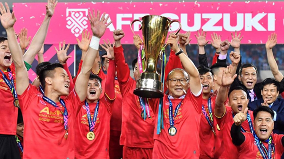 | HLV Park Hang-seo và các thành viên Đội tuyển bóng đá quốc gia Việt Nam nâng cao cúp vô địch AFF Suzuki Cup 2018. |