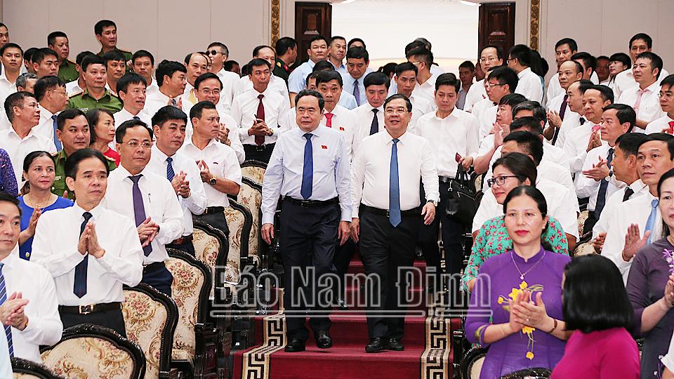| Đồng chí Trần Thanh Mẫn, Ủy viên Bộ Chính trị, Chủ tịch Quốc hội và các đồng chí lãnh đạo, các đại biểu dự Hội nghị công bố Nghị quyết của Ủy ban Thường vụ Quốc hội về sắp xếp đơn vị hành chính cấp huyện, cấp xã tỉnh Nam Định giai đoạn 2023 - 2025. |