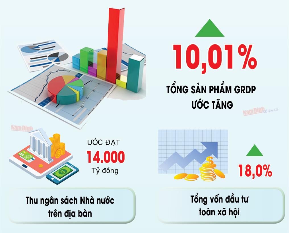 N ăm 2024 tiếp tục là một năm rất thành công của tỉnh Nam Định. Kinh tế có bước phát triển cả về quy mô và chất lượng tăng trưởng, hoàn thành và hoàn thành vượt mức 14/14 chỉ tiêu. Tổng sản phẩm GRDP tăng 10,01%, đứng thứ 9 toàn quốc, thứ 4 vùng đồng bằng sông Hồng. Tổng vốn đầu tư toàn xã hội ước tăng 18%, Chỉ số sản xuất công nghiệp (IIP) ước tăng 14,5%, Thu ngân sách nhà nước ước đạt 14.000 tỷ đồng tăng 2,4 lần so với năm 2020 (vượt xa chỉ tiêu Nghị quyết Đại hội Đảng bộ tỉnh lần thứ XX đã đề ra là 10.000 tỷ đồng). Tạo nền tảng vững chắc để thực hiện thắng lợi Nghị quyết Đại hội đảng bộ tỉnh lần thứ XX.