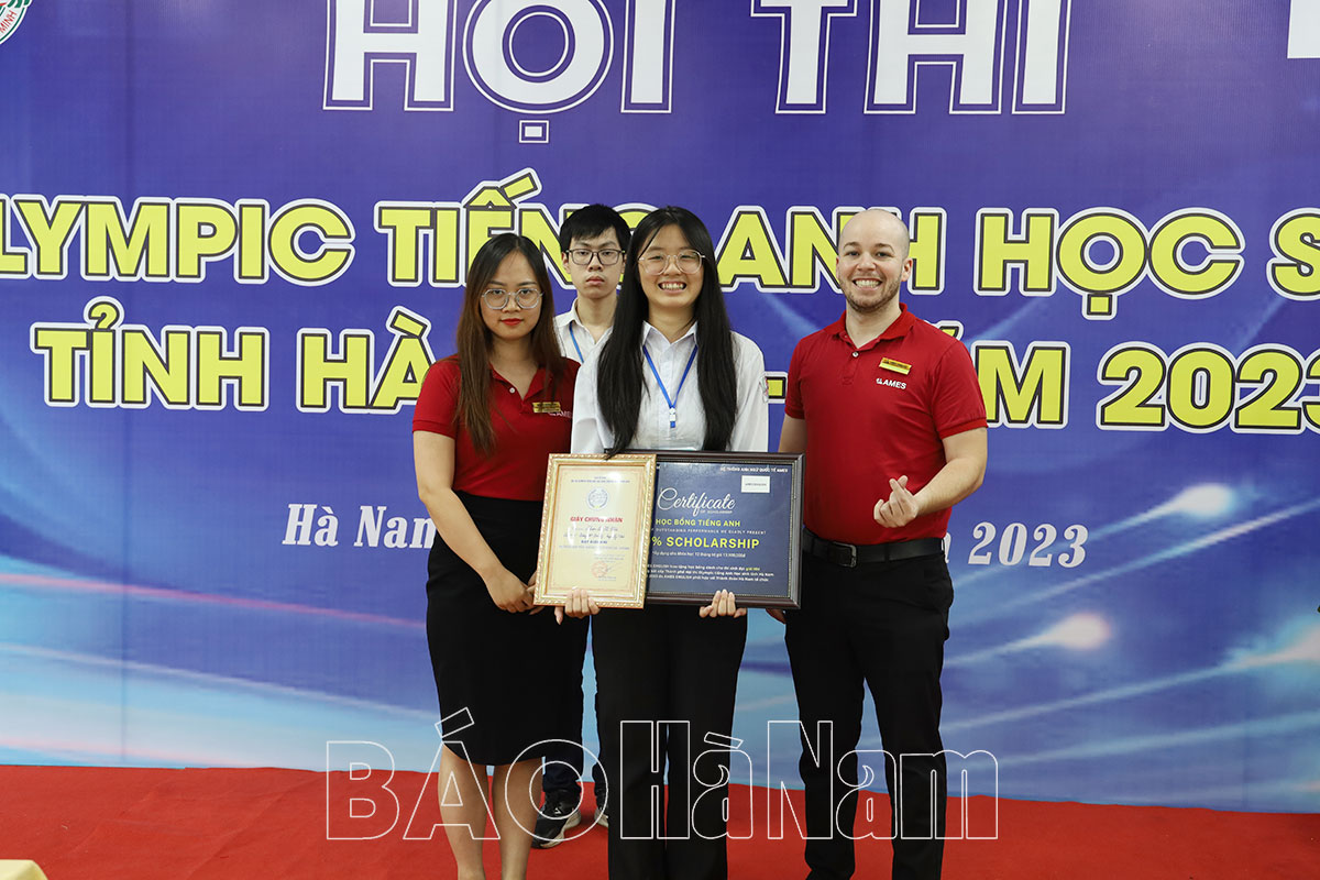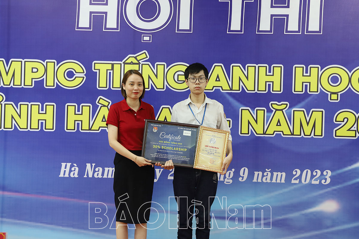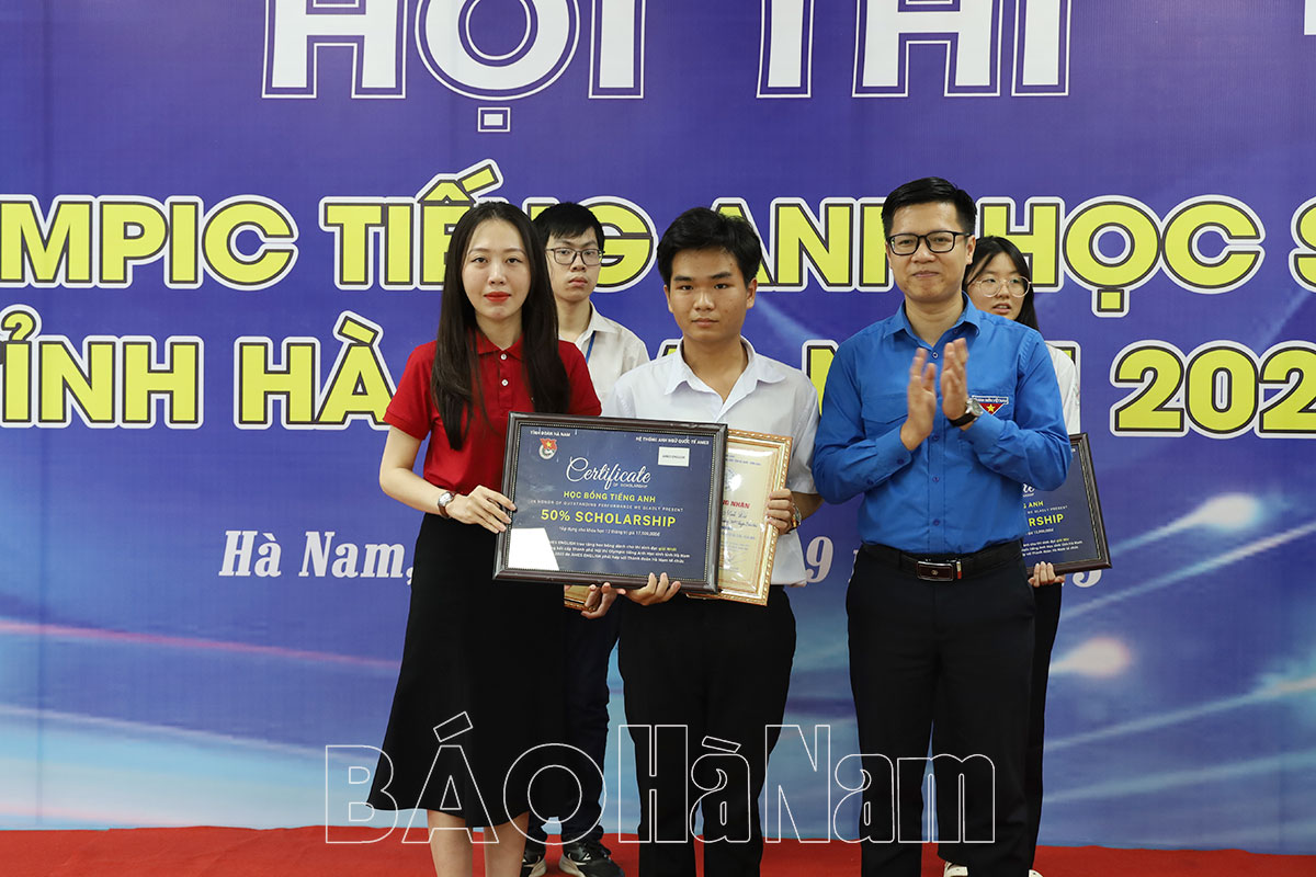 Cụ thể, em Đặng Minh Đức, Trường THPT chuyên Biên Hòa đã giành giải Nhất hội thi và nhận được suất học bổng trị giá 17,5 triệu đồng từ Trung tâm Anh ngữ AMES Hà Nam; em Phạm Lê Hà Châu, Trường THPT Bắc Lý (Lý Nhân) đạt giải Nhì và nhận được suất học bổng trị giá 13,9 triệu đồng; em Nguyễn Tấn Dũng, Trường THPT chuyên Biên Hòa đạt giải Ba và nhận được suất học bổng trị giá 10,5 triệu đồng. Các thí sinh còn lại đều được nhận Giấy chứng nhận của Tỉnh đoàn.