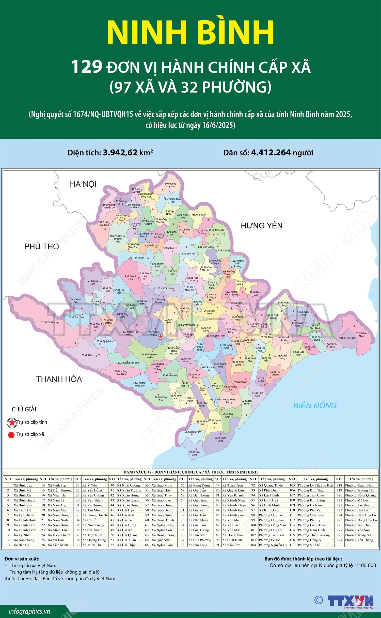 129 đơn vị hành chính cấp xã của tỉnh Ninh Bình năm 2025