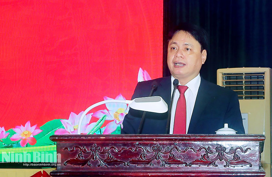 Đồng chí Trần Minh Thắng, Ủy viên Ban Thường vụ Tỉnh ủy, Bí thư Đảng ủy, Chủ tịch HĐND phường Nam Định phát biểu tại buổi lễ.