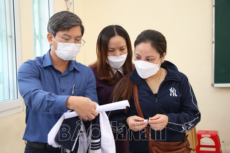 Phụ huynh học sinh trường THCS Trần Phú, thành phố Phủ Lý kiểm tra vaccine trước khi tiêm cho con em mình vào tháng 11/2021