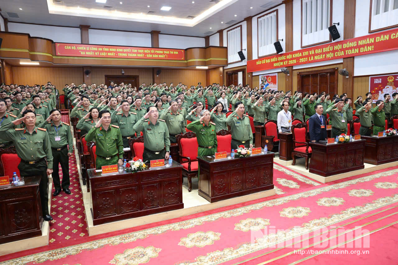Các cử tri Công an tỉnh (thuộc Khu vực bầu cử số 30, phường Hoa Lư) thực hiện nghi thức chào cờ tại Lễ khai mạc bầu cử. Ảnh Hồng Nhung