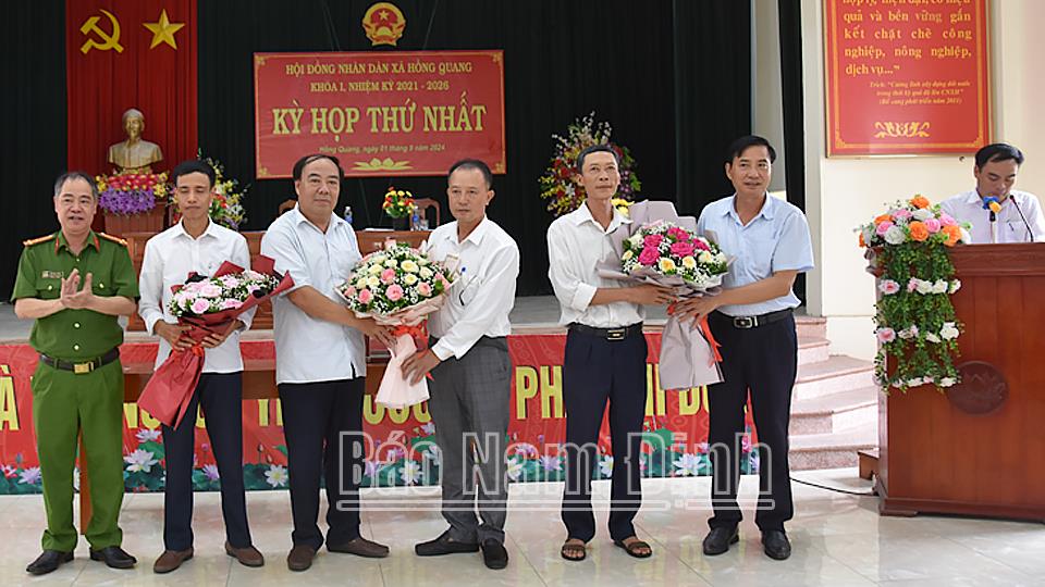 | Lãnh đạo huyện Ý Yên tặng hoa chức mừng các đồng chí được bầu các chức danh lãnh đạo HĐND xã Hồng Quang (Ý Yên). |