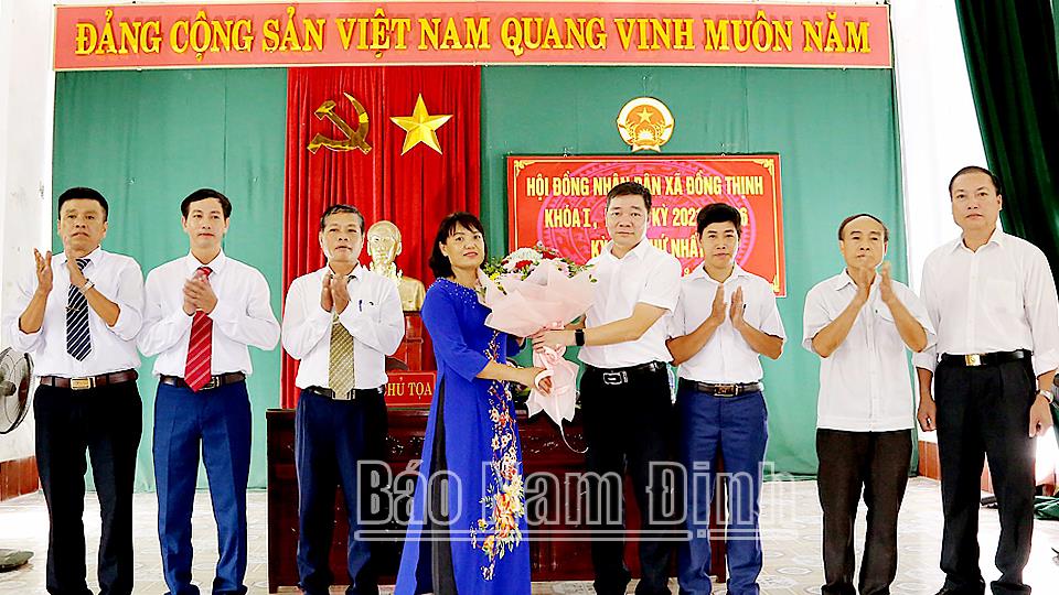 | Lãnh đạo huyện Nghĩa Hưng tặng hoa chúc mừng các đại biểu trúng cử các chức danh chủ chốt HĐND, UBND xã Đồng Thịnh. |