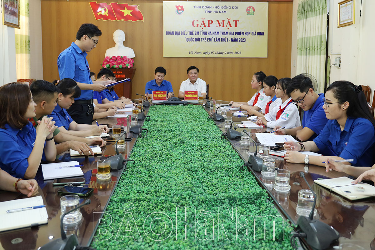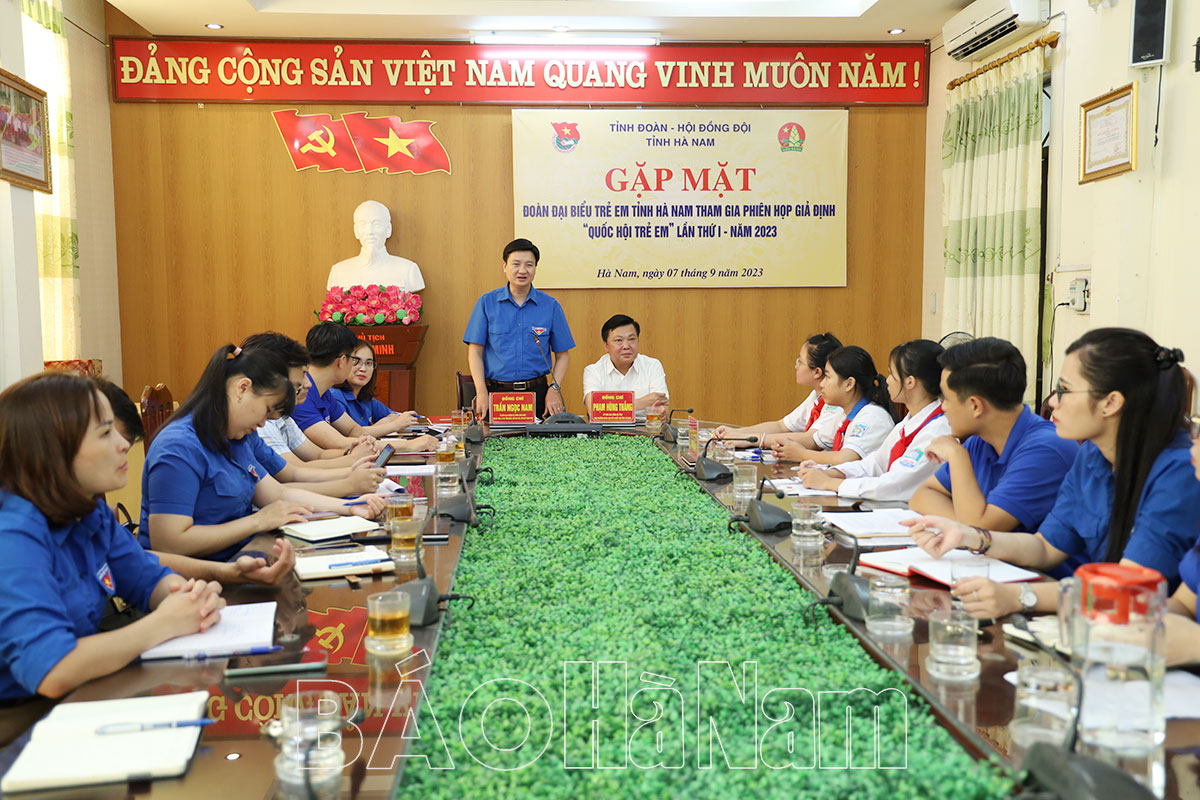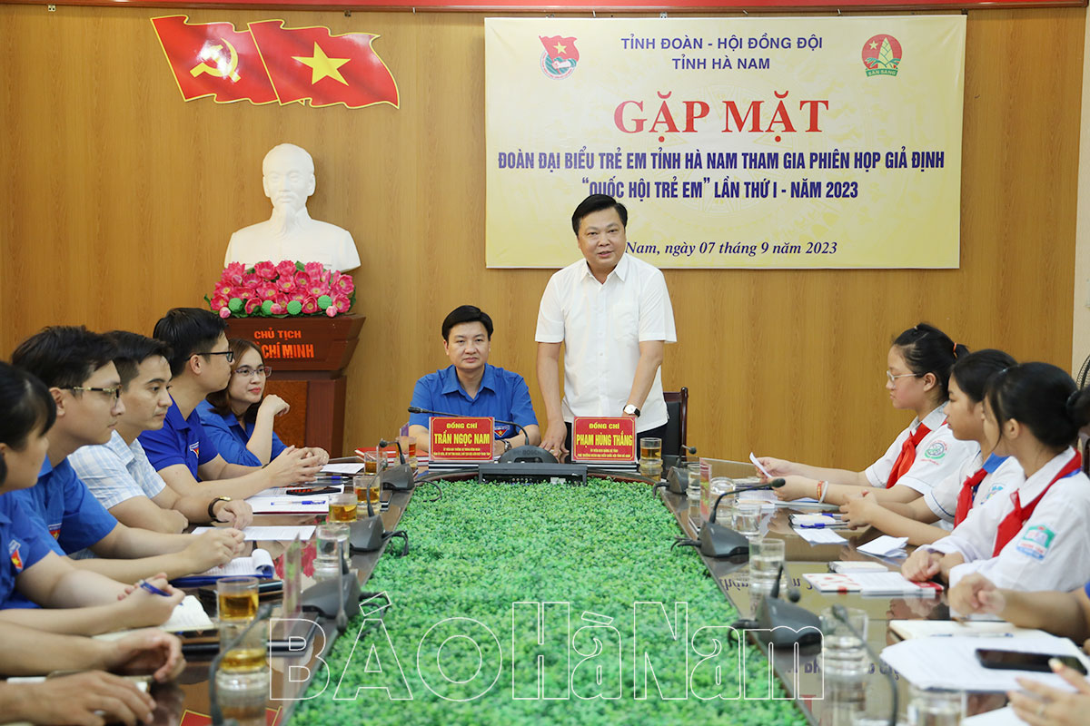 Chiều 7/9, Tỉnh đoàn, Hội đồng Đội tỉnh tổ chức gặp mặt đại biểu trẻ em tỉnh Hà Nam tham gia Phiên họp giả định “Quốc hội trẻ em” lần thứ I năm 2023. Dự chương trình gặp mặt có đồng chí Phạm Hùng Thắng, Tỉnh ủy viên, Phó Trưởng đoàn Đại biểu Quốc hội tỉnh.