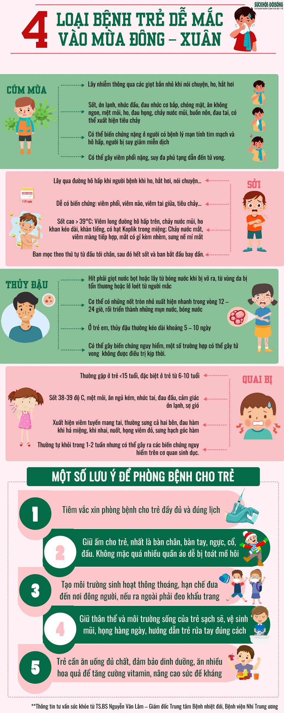 Theo TS.BS Nguyễn Văn Lâm – Giám đốc Trung tâm Bệnh nhiệt đới, Bệnh viện Nhi Trung ương, mùa Đông - Xuân với nền nhiệt trong ngày thay đổi thất thường và độ ẩm cao là điều kiện cho các loại virus, vi khuẩn phát triển, làm tăng nguy cơ bùng phát dịch bệnh, đặc biệt là các bệnh lây truyền qua đường hô hấp.