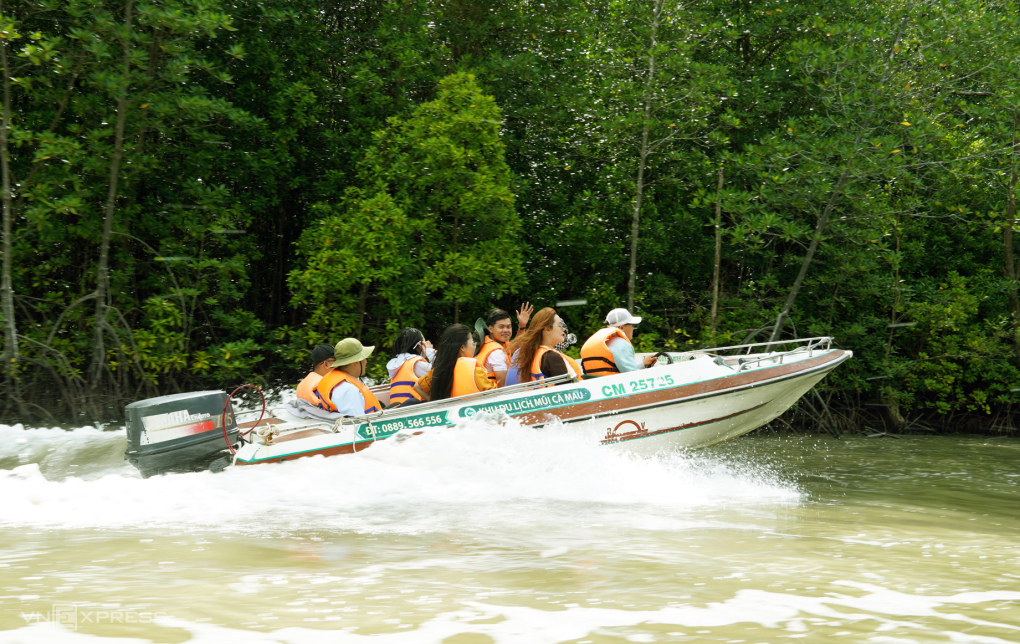 Tuyến tham quan xuyên rừng Vườn quốc gia Mũi Cà Mau thu hút rất đông du khách đến trải nghiệm, khám phá. Ngoài việc ngồi ca nô hoặc vỏ lãi đi xuyên qua những cánh rừng ngập mặn để ngắm cảnh, check in, khách còn được trải nghiệm bắt nghêu ở bãi bồi.