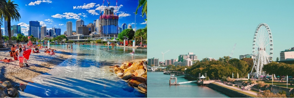 Bãi biển nhân tạo Streets Beach và vòng đu quay khổng lồ (phải) tại South Bank Parklands là điểm đến thư giãn cuối tuần của người dân Brisbane. Ảnh: Unsplash