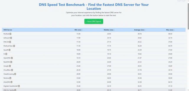 Tốc độ của các máy chủ DNS có thể khác nhau tùy thuộc vào vị trí địa lý của bạn. Hãy sử dụng các công cụ trực tuyến miễn phí như DNS Speed Test Benchmark hoặc DNSPerf để kiểm tra và tìm ra máy chủ DNS nào cho hiệu suất tốt nhất tại khu vực bạn đang ở.