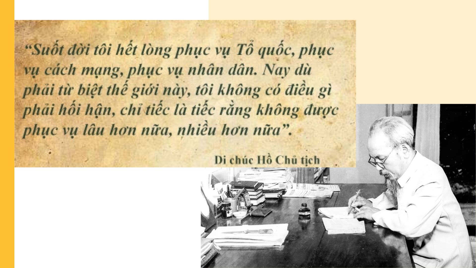 1. Độc lập dân tộc và chủ nghĩa xã hội là điểm hội tụ tinh hoa tư tưởng và mục tiêu hành động cách mạng của Chủ tịch Hồ Chí Minh. Trọn cuộc đời, Người luôn cống hiến, hy sinh vì mục tiêu cao cả đó. Trước lúc đi xa, Người đã để lại cho toàn Đảng, toàn dân, toàn quân ta bản Di chúc lịch sử. Di chúc kết tinh toàn bộ tư tưởng của Người về cách mạng Việt Nam, đưa ra những chỉ dẫn cụ thể, sâu sắc để cách mạng nước ta đạt thắng lợi mục tiêu độc lập dân tộc và chủ nghĩa xã hội. Người bày tỏ: “Điều mong muốn cuối cùng của tôi là: Toàn Đảng, toàn dân ta đoàn kết phấn đấu, xây dựng một nước Việt Nam hòa bình, thống nhất, độc lập, dân chủ và giàu mạnh, và góp phần xứng đáng vào sự nghiệp cách mạng thế giới”. Di chúc của Người đã trở thành kim chỉ nam định hướng con đường cách mạng của Đảng và nhân dân ta. Nội dung Di chúc khẳng định những vấn đề có tính chất chiến lược, căn cốt: