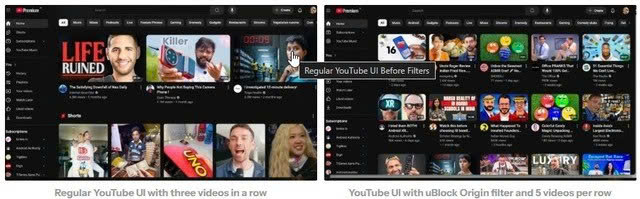 Bạn có thể thay đổi số 5 thành số lượng video mong muốn. Lưu ý, cách này không hoạt động với uBlock Origin trên Chrome do hạn chế về bộ lọc tùy chỉnh.