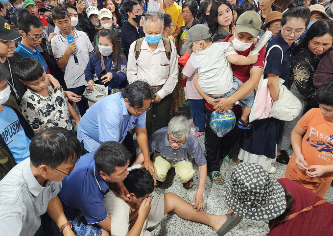 Hành khách ngất xỉu khi chen chúc trong đám đông tại ga Bến Thành hôm 22/12. Ảnh: Đình Văn