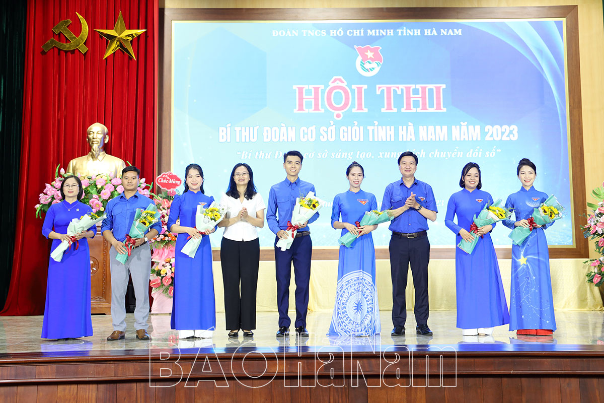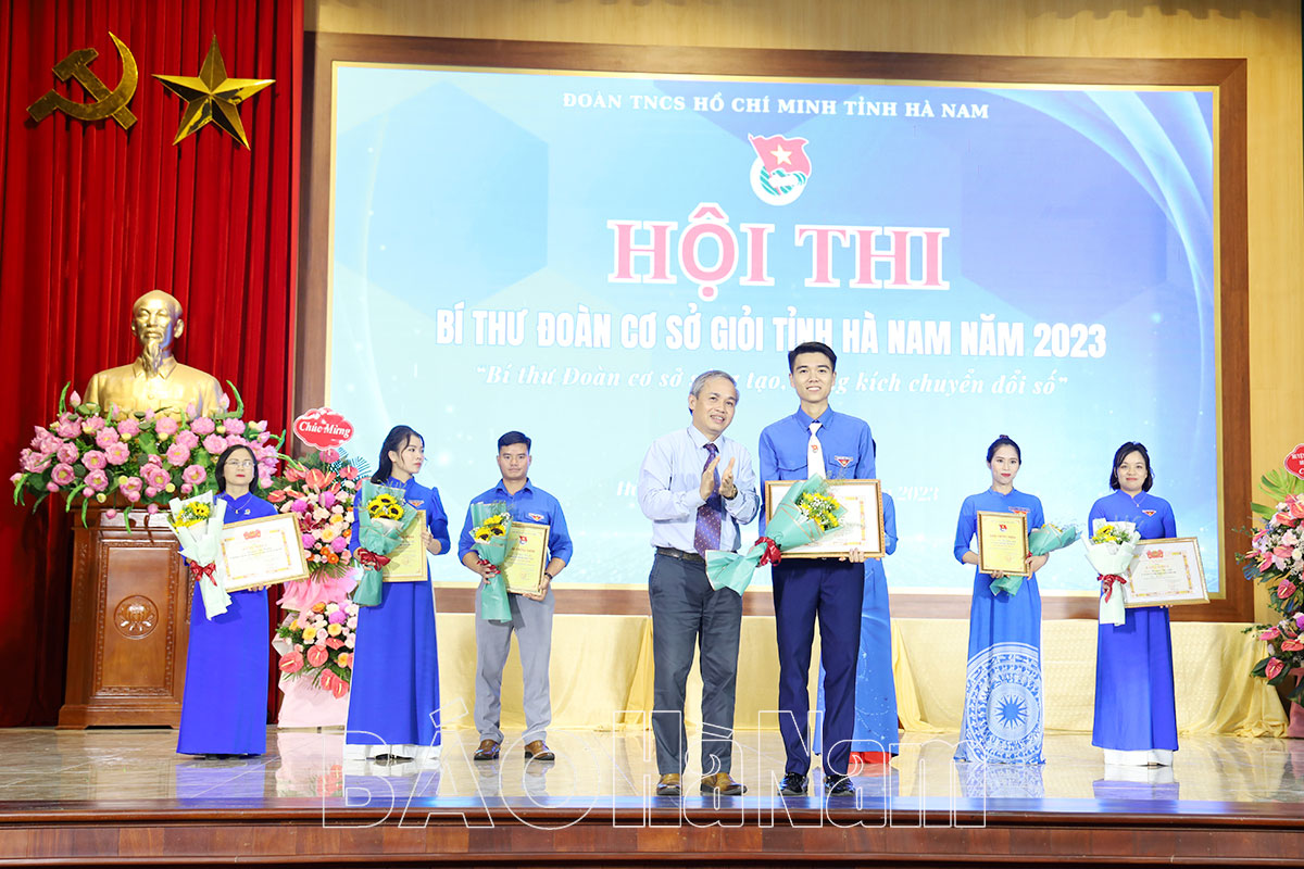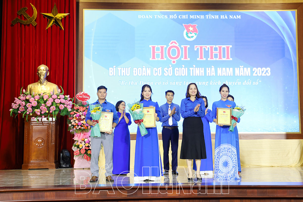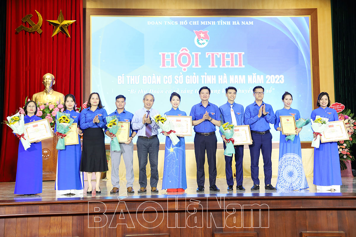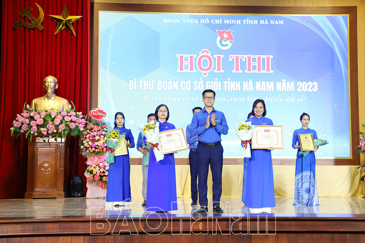 Bí thư Tỉnh đoàn Trần Ngọc Nam tặng Bằng khen của Tỉnh đoàn cho Bí thư Đoàn Phường Hai Bà Trưng (TP Phủ Lý) Lại Thị Cẩm Vân, thí sinh đạt giải Nhất tại hội thi.Bí thư Đoàn xã Trác Văn (Duy Tiên) Trịnh Phương Nam được trao giải Nhì tại hội thi.Lãnh đạo Tỉnh đoàn trao giải Ba cho Bí thư Đoàn Sở Văn hóa – Thể thao và Du lịch (Đoàn Khối các cơ quan tỉnh) và Bí thư Đoàn xã Thanh Hương (Thanh Liêm).