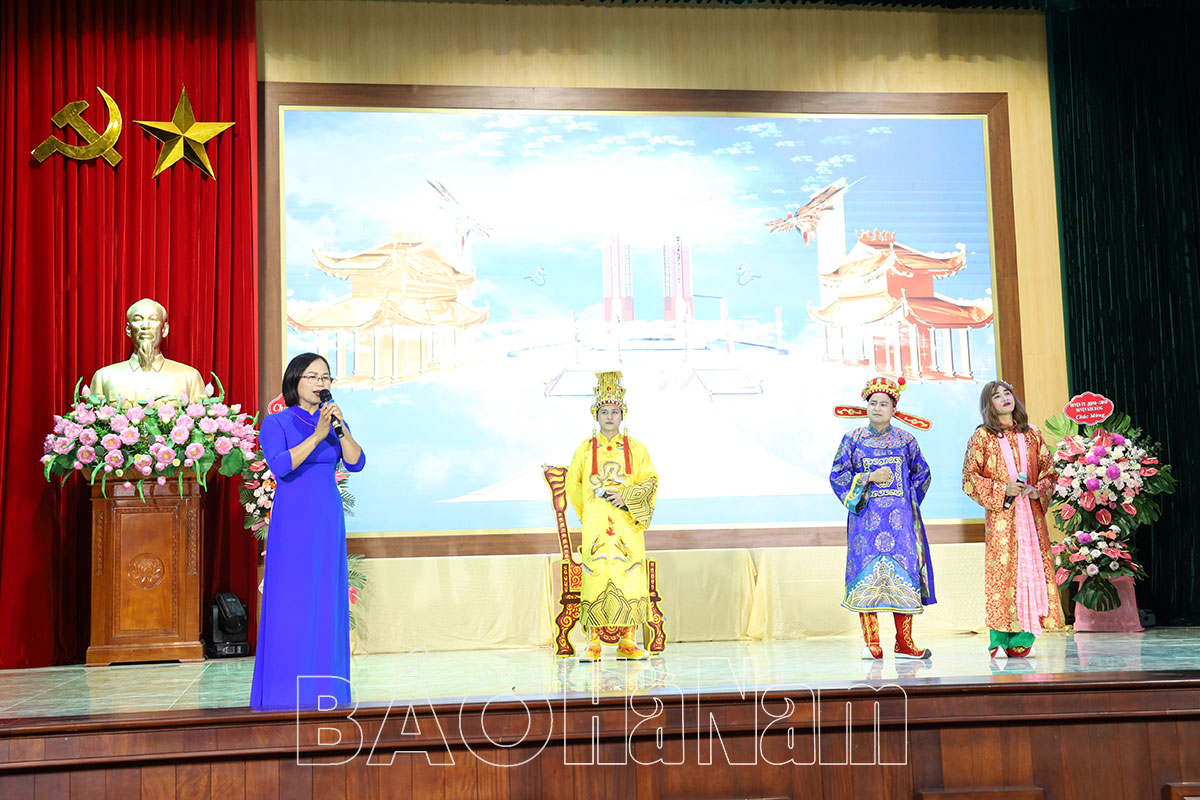 Các đại biểu dự hội thi.Đồng chí Trần Thị Ngân, Ủy viên Ban Thường vụ Tỉnh ủy, Chủ tịch Ủy ban Mặt trận Tổ quốc tỉnh tặng hoa chúc mừng Ban Tổ chức hội thi.