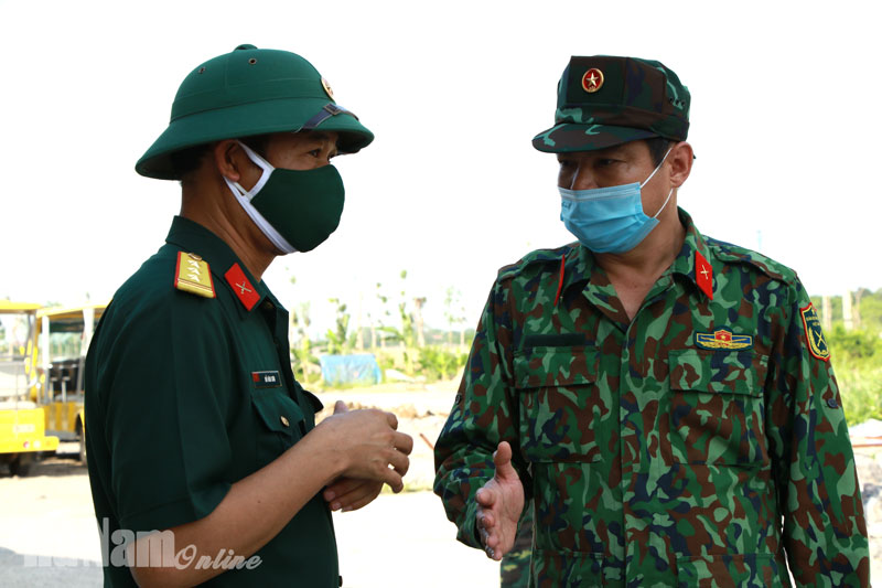 Thượng tá Trịnh Đức Thiêm, Phó Chỉ huy Trưởng Bộ Chỉ huy Quân sự tỉnh, Trưởng Ban Chỉ đạo phòng, chống dịch Covid-19 Bộ Chỉ huy Quân sự tỉnh (bên phải) trực tiếp chỉ đạo lực lượng tổ chức cách ly tập trung tại Tam Chúc