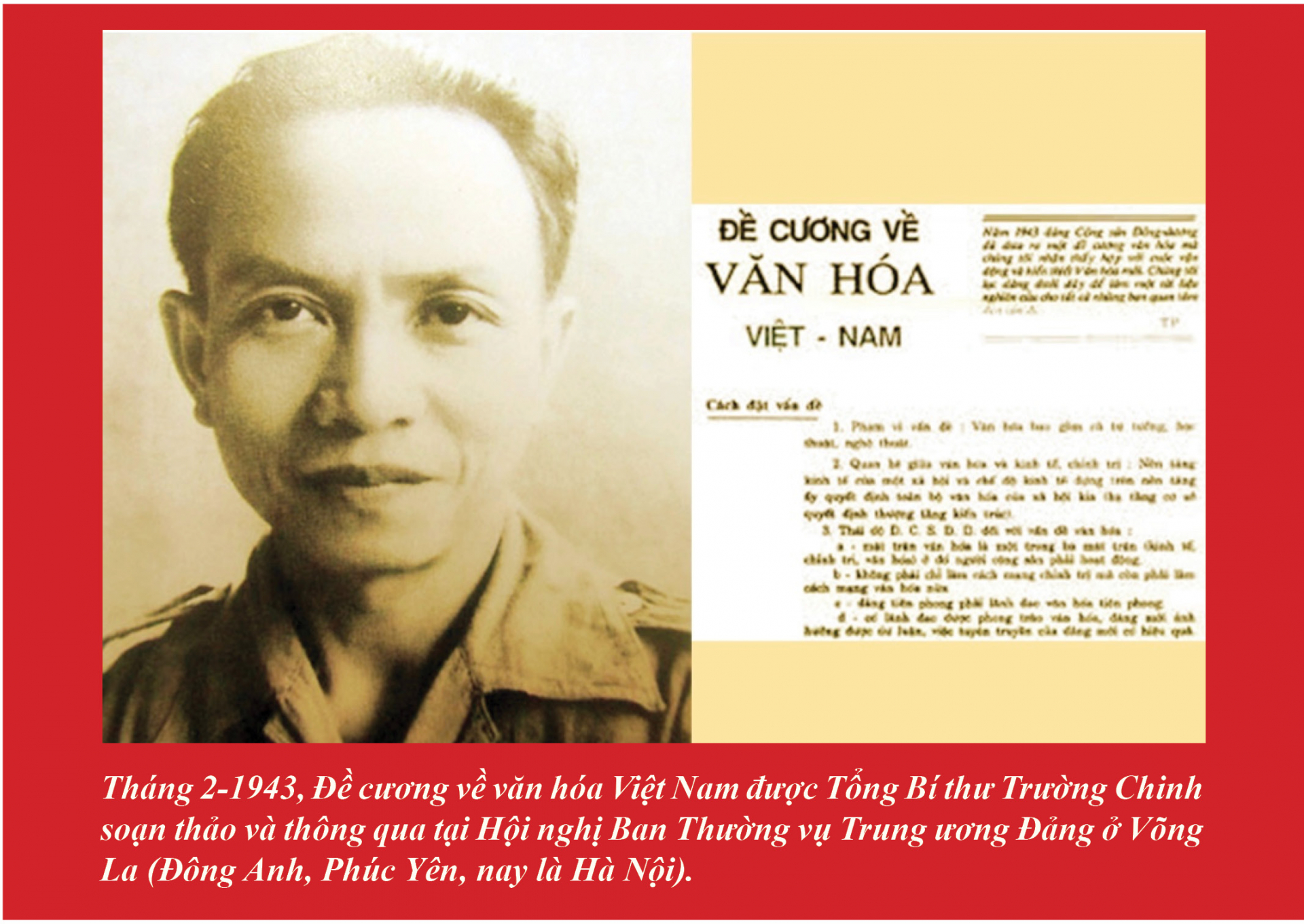 Tháng 2-1943, Đề cương về văn hóa Việt Nam được Tổng Bí thư Trường Chinh soạn thảo và thông qua tại Hội nghị Ban Thường vụ Trung ương Đảng ở Võng La (Đông Anh, Phúc Yên, nay là Hà Nội). Sau 80 năm, những tư tưởng của Đề cương văn hóa vẫn còn nguyên giá trị, góp phần định hướng cho sự nghiệp xây dựng và phát triển nền văn hóa Việt Nam tiên tiến, đậm đà bản sắc dân tộc, đáp ứng yêu cầu phát triển bền vững đất nước trong quá trình hội nhập quốc tế. Nam Định tự hào là quê hương nơi sinh ra và nuôi dưỡng đồng chí Trường Chinh - Người chiến sĩ cộng sản kiên cường, mẫu mực; người học trò xuất sắc của Chủ tịch Hồ Chí Minh; nhà lãnh đạo kiệt xuất của Đảng và cách mạng Việt Nam; nhà lý luận, nhà văn hóa, nhà báo, nhà thơ lớn, đã cống hiến trọn đời mình cho sự nghiệp đấu tranh giải phóng dân tộc, thống nhất đất nước, xây dựng và bảo vệ Tổ quốc Việt Nam xã hội chủ nghĩa.