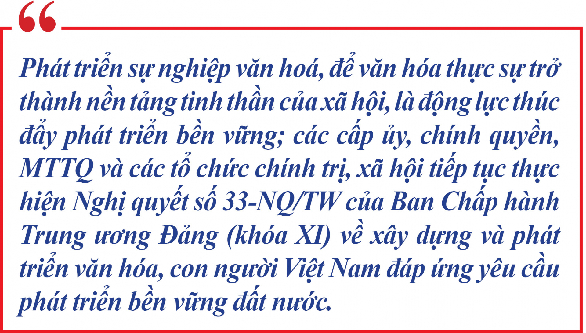 Tiếp tục xây dựng, giữ gìn và phát triển nền văn hóa Việt Nam tiên tiến, đậm đà bản sắc dân tộc, thực sự là nền tảng tinh thần, động lực phát triển và soi đường cho quốc dân đi; phát huy giá trị văn hóa và sức mạnh con người Việt Nam, khơi dậy khát vọng phát triển đất nước phồn vinh, thịnh vượng, tạo ra sức mạnh tổng hợp của toàn dân tộc