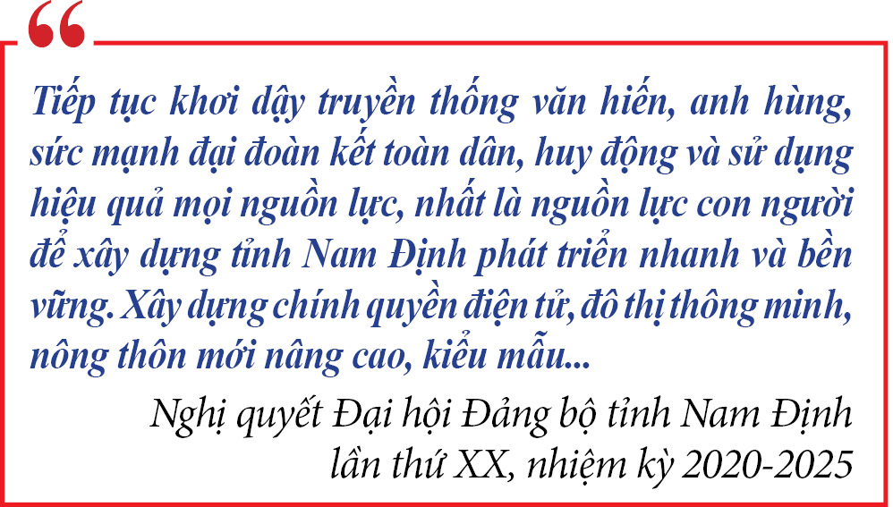 Nghị quyết số 07-NQ/TU ngày 9-6-2016 của Tỉnh ủy về "Xây dựng môi trường văn hóa lành mạnh, góp phần thúc đẩy phát triển kinh tế - xã hội tỉnh Nam Định " và Kết luận số 75-KL/TU ngày 14-12-2021 về tiếp tục thực hiện Nghị quyết số 07-NQ/TU khẳng định sự quan tâm, trách nhiệm của tỉnh Nam Định trong việc phát triển văn hóa ngày càng gắn bó hơn với xây dựng con người, đưa văn hóa từng bước trở thành một trong những nguồn lực quan trọng của sự nghiệp phát triển bền vững và hội nhập kinh tế quốc tế. Nghị quyết Đại hội Đảng bộ tỉnh Nam Định lần thứ XX, nhiệm kỳ 2020-2025 nêu rõ: "Tiếp tục khơi dậy truyền thống văn hiến, anh hùng, sức mạnh đại đoàn kết toàn dân, huy động và sử dụng hiệu quả mọi nguồn lực, nhất là nguồn lực con người để xây dựng tỉnh Nam Định phát triển nhanh và bền vững. Xây dựng chính quyền điện tử, đô thị thông minh, nông thôn mới nâng cao, kiểu mẫu; Chú trọng bảo vệ môi trường và phát triển toàn diện lĩnh vực văn hóa, xã hội. Phấn đấu đến năm 2030, Nam Định là tỉnh phát triển khá của cả nước."