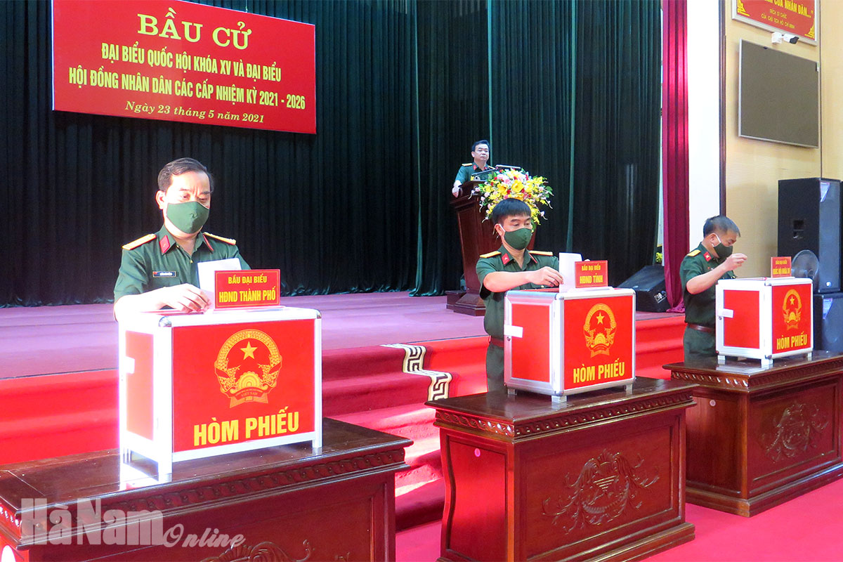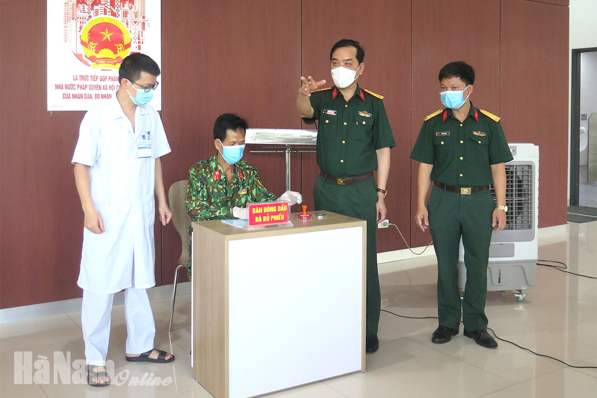 Sau khai mạc bầu cử và tiến hành bỏ phiếu tại đơn vị, lãnh đạo Bộ CHQS tỉnh đã đi kiểm tra công tác bầu cử ở các khu cách ly y tế tập trung phòng dịch Covid-19. Các cơ sở cách ly tập trung trên toàn tỉnh có tổng số 876 cử tri, trong đó 4 cơ sở cách ly tập trung do Bộ CHQS tỉnh trực tiếp quản lý gồm: Trung đoàn 151 (thuộc tổ bầu cử số 4, Đơn vị bầu cử số 7, thị trấn Tân Thanh, huyện Thanh Liêm); Trường Cao đẳng y tế Hà Nam (thuộc tổ bầu cử số 1, Đơn vị bầu cử số 2, phường Lê Hồng Phong, thành phố Phủ Lý); Trường Cao đẳng nghề Hà (thuộc tổ bầu cử số 5, đơn vị bầu cử số 1, phường Quang Trung, thành phố Phủ Lý).