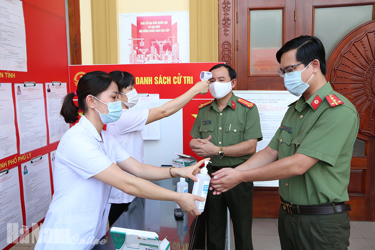 Để đảm bảo công tác phòng, chống dịch, Công an Hà Nam đã bố trí lực lượng y tế tiến hành đo thân nhiệt, sát khuẩn và hướng dẫn cử tri bảo đảm khoảng cách phòng ngừa dịch bệnh khi tham gia bầu cử.