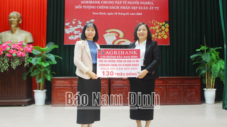 Sáng 16/1, Ngân hàng Nông nghiệp và Phát triển nông thôn Việt Nam (Agribank) Chi nhánh Bắc Nam Định phối hợp với Hội Nông dân thành phố Nam Định trao 120 suất quà Tết tặng các hội viên nông dân có hoàn cảnh khó khăn trên địa bàn các phường: Mỹ Xá, Lộc Hòa, Trường Thi, Cửa Nam, Lộc Hạ, Nam Phong và xã Nam Vân.
