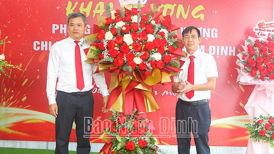 | Ông Trịnh Thiết Cương, Giám đốc Agribank Bắc Nam Định tặng hoa chúc mừng Phòng giao dịch Lộc Vượng. |