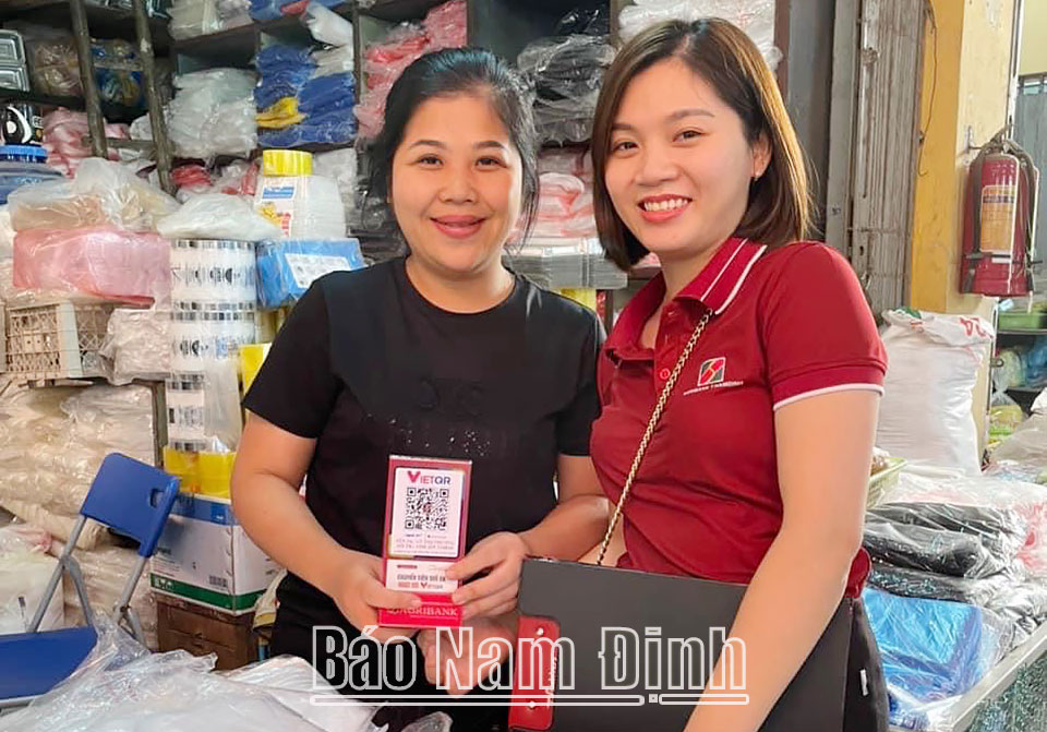 | Cán bộ Agribank Chi nhánh tỉnh Nam Định trao thiết bị, phụ kiện phục vụ thanh toán bằng mã VietQR cho tiểu thương ở chợ Rồng (thành phố Nam Định). |