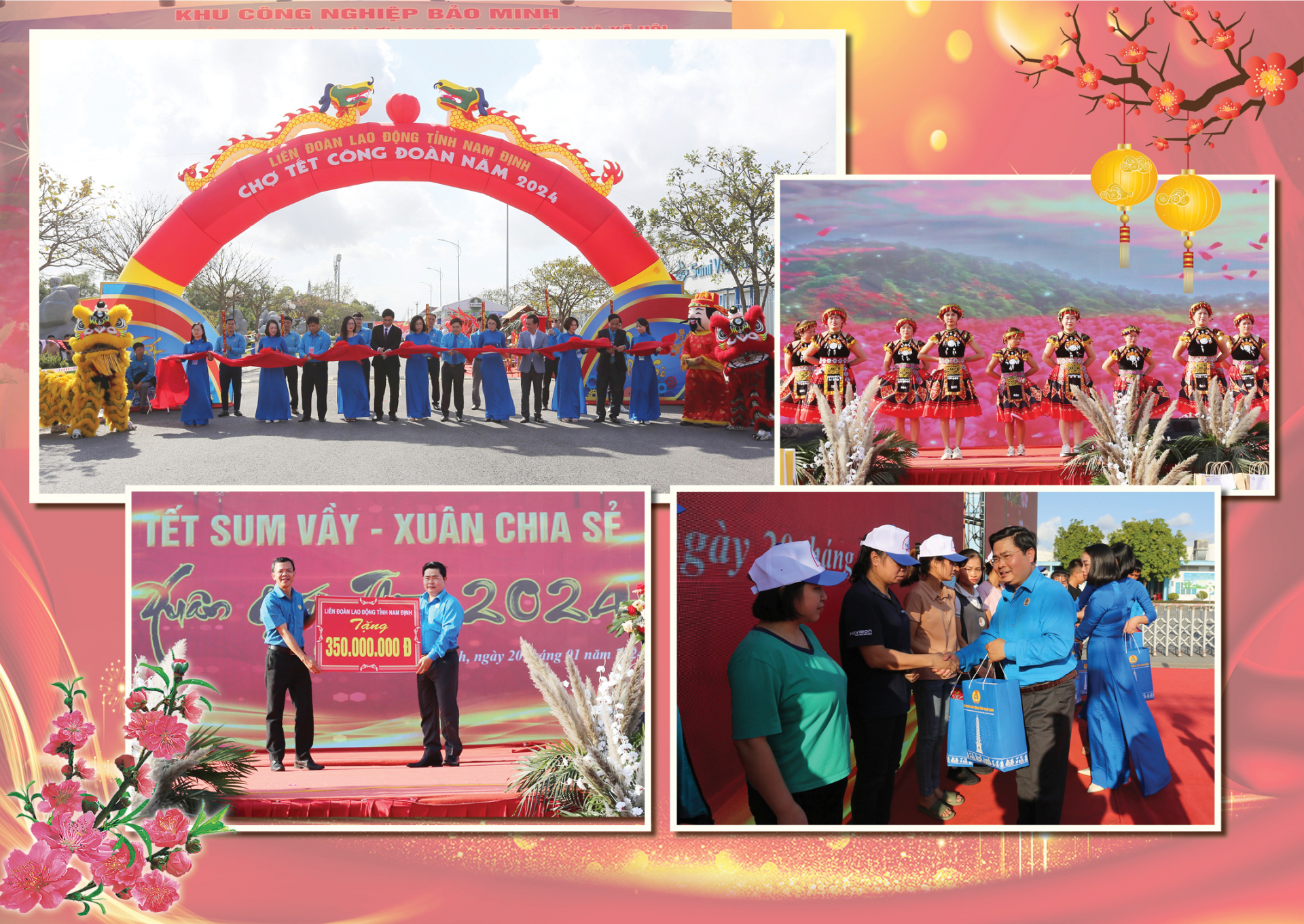 hởi đầu cho chuỗi chương trình “Tết sum vầy - Xuân chia sẻ” trong tỉnh, LĐLĐ tỉnh đã phối hợp với Ban Quản lý các khu công nghiệp (KCN) tỉnh, Công ty Cổ phần xây dựng hạ tầng KCN Bảo Minh (Vụ Bản) tổ chức chương trình “Tết sum vầy - Xuân chia sẻ" năm 2024. Tại chương trình các đơn vị đã trao hơn 130 suất quà Tết cho công nhân, lao động và học sinh có hoàn cảnh khó khăn, liên hoan tiếng hát công nhân, bốc thăm trúng thưởng, bắn pháo hoa... Bên cạnh các hoạt động trao quà Tết, LĐLĐ tỉnh đã phối hợp tổ chức chuỗi các hoạt động như: tổ chức chương trình “Chợ Tết công đoàn” với 20 gian hàng bày bán hàng trăm sản phẩm OCOP của nhiều doanh nghiệp trong và ngoài tỉnh, là những mặt hàng thiết yếu phục vụ nhu cầu tiêu dùng trong dịp Tết của đoàn viên, người lao động và đã giảm giá từ 10-20% so với giá thị trường. Tại “Chợ Tết Công đoàn”, LĐLĐ tỉnh tặng 1.500 suất quà, tổng trị giá 750 triệu đồng cho đoàn viên, công nhân lao động có hoàn cảnh khó khăn, mỗi suất quà trị giá 500 nghìn đồng; tặng 495 phiếu mua hàng trị giá 100 nghìn đồng/phiếu cho công nhân lao động. Ngoài ra, LĐLĐ tỉnh phối hợp với Phòng Khám đa khoa An Nhiên, KCN Bảo Minh bố trí khu khám sức khỏe, siêu âm, chụp X quang, xét nghiệm miễn phí và tư vấn pháp luật lao động cho đoàn viên và người lao động.