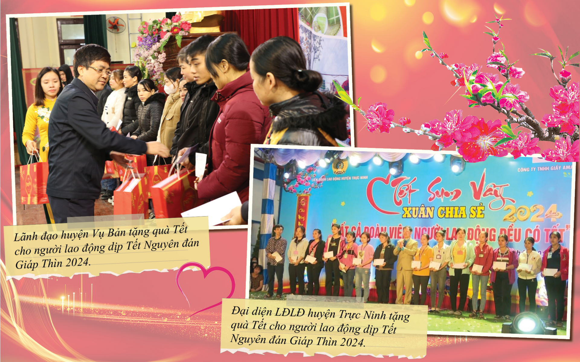 Tại nhiều huyện, thành phố đã tổ chức “Tết sum vầy” với nhiều hoạt động thiết thực. Điển hình như LĐLĐ huyện Vụ Bản đã tổ chức chương trình “Tết sum vầy - Xuân chia sẻ” với hàng nghìn công nhân lao động tham gia. Tại chương trình, Đoàn đại biểu Quốc hội tỉnh, LĐLĐ tỉnh và huyện Vụ Bản đã trao hơn 380 suất quà cho công nhân lao động có hoàn cảnh khó khăn; trong đó, Đoàn đại biểu Quốc hội tỉnh đã trao tặng 30 suất quà, mỗi suất trị giá 1 triệu đồng; LĐLĐ tỉnh đã trao tặng 30 suất quà, mỗi suất trị giá 500 nghìn đồng; lãnh đạo huyện và LĐLĐ huyện Vụ Bản đã trao hơn 320 suất quà, trị giá hơn 161 triệu đồng. Tại huyện Hải Hậu, Công đoàn Công ty TNHH Smart Shirts Hải Hậu tổ chức “Tết sum vầy - Xuân chia sẻ” với sự tham gia nhiệt tình, đông đủ của Ban lãnh đạo công ty cùng hơn 1.400 cán bộ, công nhân viên. Tại chương trình, những phần quà đặc biệt bao gồm tủ lạnh, ti vi và nhiều phần quà ý nghĩa, thiết thực như lò vi sóng, nồi chiên không dầu, nồi cơm điện, ấm đun nước, phong bao lì xì may mắn… được trao đi như những món quà may mắn đầu năm gửi tới tất cả cán bộ nhân viên. Bên cạnh đó, LĐLĐ huyện đã tặng 170 suất quà cho công nhân có hoàn cảnh khó khăn.