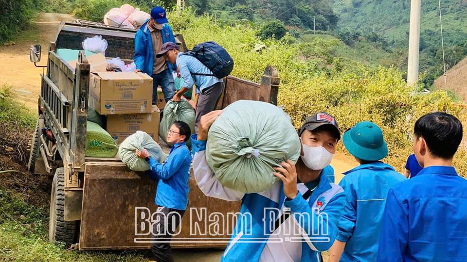| Đoàn viên, thanh niên huyện Xuân Trường vận chuyển hàng hóa hỗ trợ trẻ em vùng cao. |