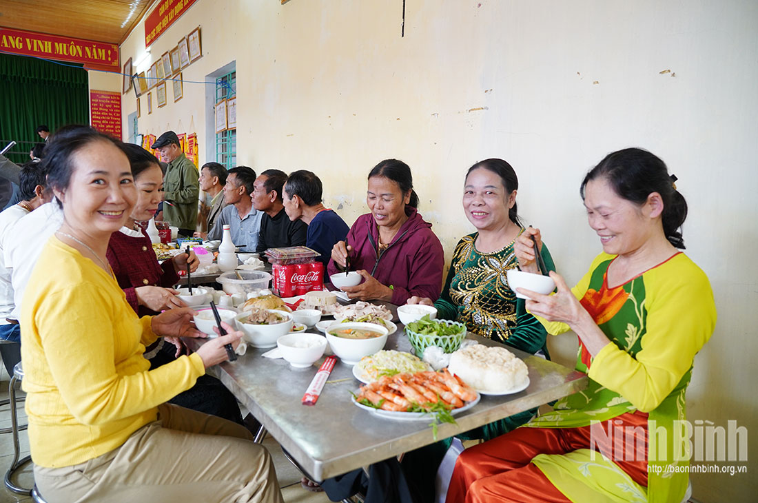 Vừa thoăn thoắt bày biện mâm cỗ, bà Vũ Thị Lan - một trong những người phụ nữ tham gia nấu nướng - vui vẻ chia sẻ: “Đã thành truyền thống nhiều năm nay, thôn chúng tôi đều tổ chức bữa cơm đại đoàn kết. Được tự tay làm nên mâm cơm này, dù vất vả hơn so với đi đặt cỗ nhưng lại là niềm vui lớn. Mọi người bảo nhau, mỗi người một việc, ai thạo món nào thì làm món đó. Cả thôn gặp nhau trong bếp, nói cười râm ran, không khí ấm áp vô cùng.”
