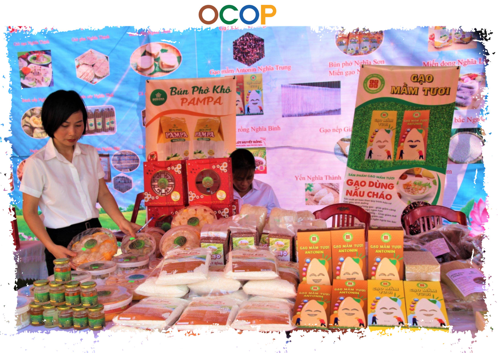 | Sản phẩm OCOP "Bún phở khô PAMPA", "Gạo mầm tươi" của hội viên nông dân huyện Nghĩa Hưng. |