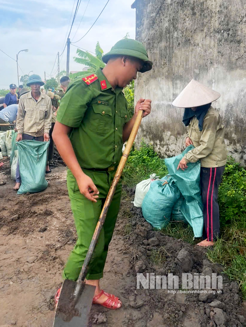 Công an và người dân địa phương đóng bao đất, bao cát để gia cố đê bối, bảo vệ an toàn khu dân cư.Công an và người dân địa phương đóng bao đất, bao cát để gia cố đê bối, bảo vệ an toàn khu dân cư.