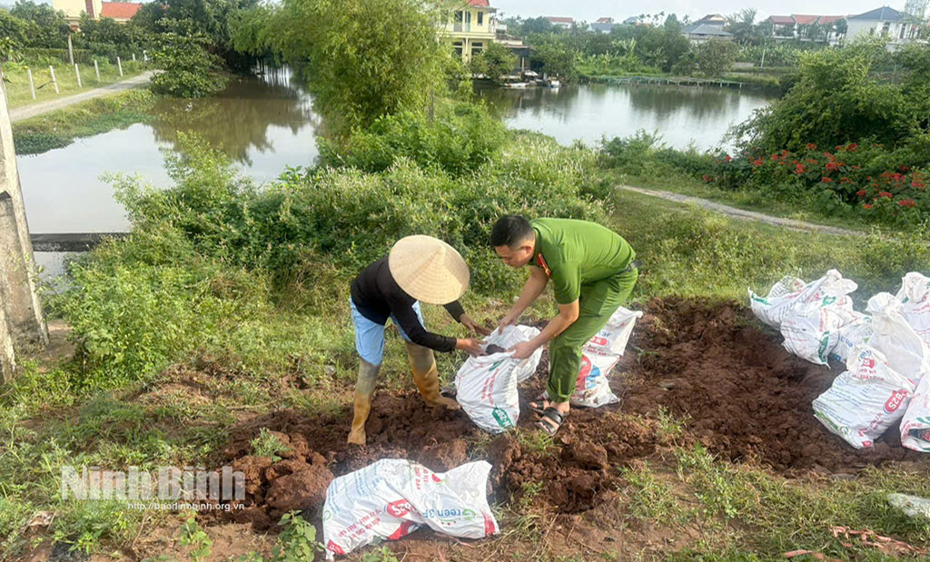 Tại xã Yên Đồng, mực nước sông Đáy dâng cao gây áp lực lớn lên tuyến đê qua thôn Trại Mễ. Công an xã Yên Đồng đã phối hợp cùng lực lượng chức năng và nhân dân địa phương tham gia hộ đê, gia cố những vị trí xung yếu nhằm bảo đảm an toàn cho khu vực.