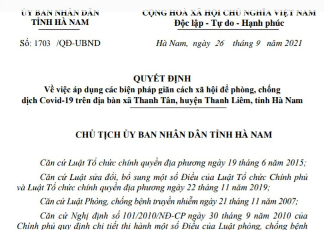 Theo Quyết định số 1703/QĐ-UBND ngày 26/9/2021, Chủ tịch UBND tỉnh quyết định áp dụng các biện pháp giãn cách xã hội theo tinh thần Chỉ thị số 16/CT-TTg ngày 31/3/2020 của Thủ tướng Chính phủ trên địa bàn xã Thanh Tân, huyện Thanh Liêm.