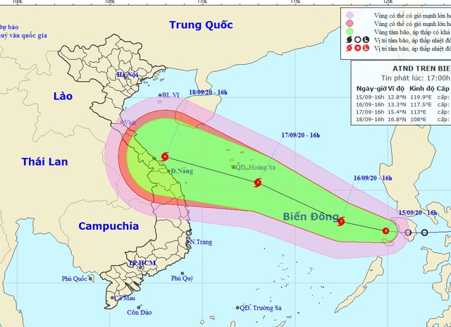 Đến 17h ngày 16/9, vị trí tâm bão ở khoảng 13,3 độ Vĩ Bắc; 117,5 độ Kinh Đông, cách quần đảo Hoàng Sa khoảng 700km về phía Đông Nam. Sức gió mạnh nhất vùng gần tâm bão mạnh cấp 8 (60-75km/giờ), giật cấp 10.