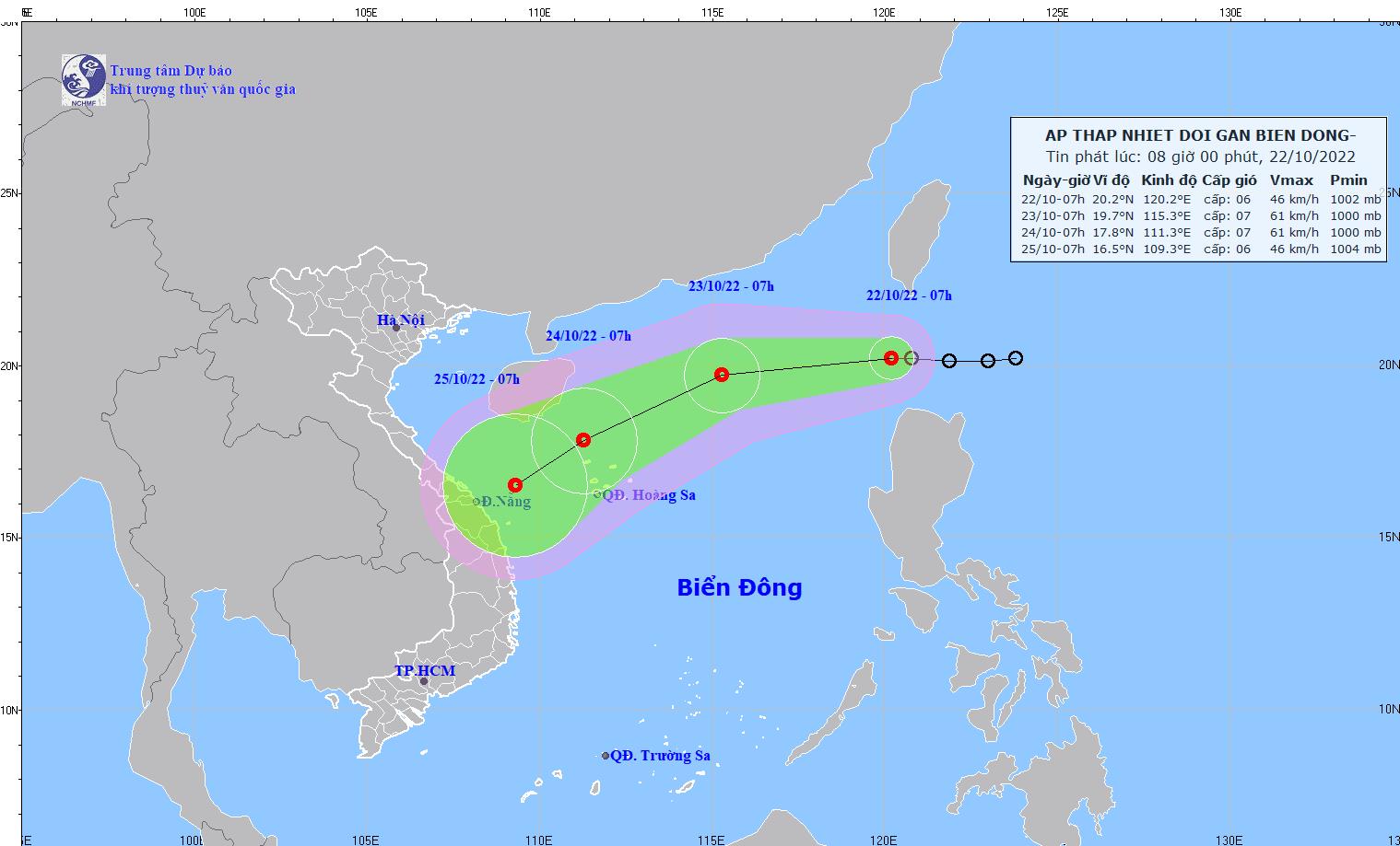 Theo Trung tâm Dự báo Khí tượng Thủy văn Quốc gia, lúc 7 giờ ngày 22/10, vị trí tâm áp thấp nhiệt đới ở vào khoảng 20,2 độ Vĩ Bắc; 120,2 độ Kinh Đông; cách đảo Lu-Dông (Philippines) khoảng 180 km về phía Bắc Tây Bắc. Sức gió mạnh nhất vùng gần tâm áp thấp nhiệt đới mạnh cấp 6 (39-49 km/giờ), giật cấp 8, di chuyển theo hướng Tây với tốc độ 15-20 km/giờ.