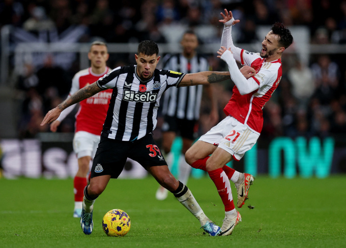 Guimaraes (trái) trong một tình huống đẩy người, ngăn Fabio Vieira áp sát ở cuối hiệp hai trận đấu tại St James' Park ngày 4/11.