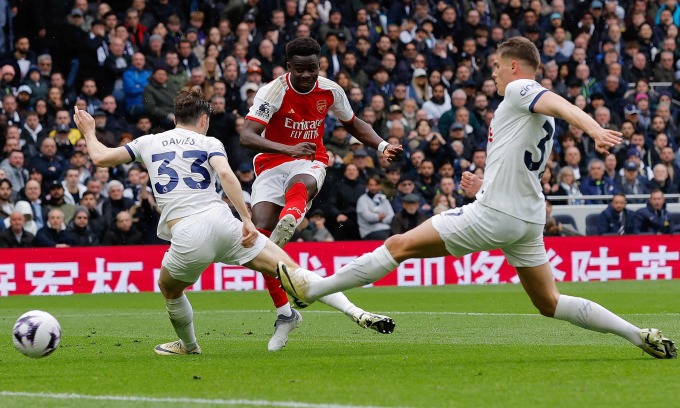 Saka trong pha làm bàn nâng tỷ số lên 2-0 cho Arsenal trong trận hạ chủ nhà Tottenham 3-2 ở vòng 35 Ngoại hạng Anh ngày 28/4.