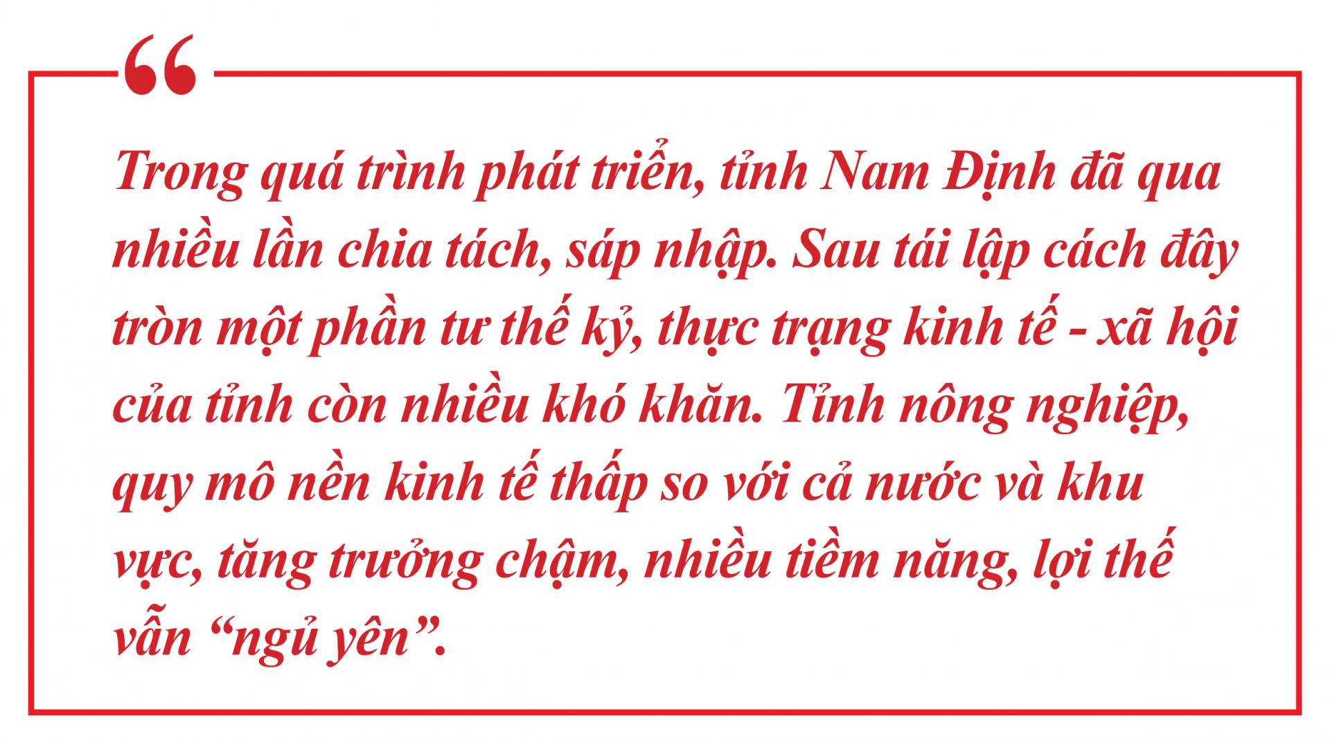 Là nơi phát tích của Vương triều Trần hiển hách trong lịch sử dân tộc, nơi Phủ Thiên Trường được xây dựng với vị thế như kinh đô thứ hai sau kinh thành Thăng Long, Nam Định có nền tảng phát triển kinh tế - xã hội (KT-XH) từ xa xưa. Thành phố Nam Định cũng từng là một trong 3 thành phố lớn của miền Bắc với nhiều ngành nghề tiểu thủ công nghiệp, làng nghề truyền thống nổi danh cả nước. Tuy nhiên, về tổng thể, Nam Định vẫn là tỉnh nông nghiệp, quy mô nền kinh tế còn nhỏ. Mặc dù giàu tiềm năng, lợi thế song đất chật, người đông, nhiều "điểm nghẽn" hạn chế, nhất là về hạ tầng giao thông nên một thời gian dài tỉnh phát triển khá khiêm tốn. Gần đây tỉnh từng bước "chuyển mình" bứt phá, phát triển khá năng động; đang trở thành "điểm đến", lựa chọn hấp dẫn của các tập đoàn, nhà đầu tư lớn trong nước và thế giới. Những thành tựu mà tỉnh đạt được thời gian qua thể hiện tinh thần đoàn kết đồng lòng, quyết tâm "vượt lên chính mình” để "biến không thành có, biến khó thành dễ" nhằm mục tiêu đến năm 2030 trở thành tỉnh phát triển khá của cả nước.