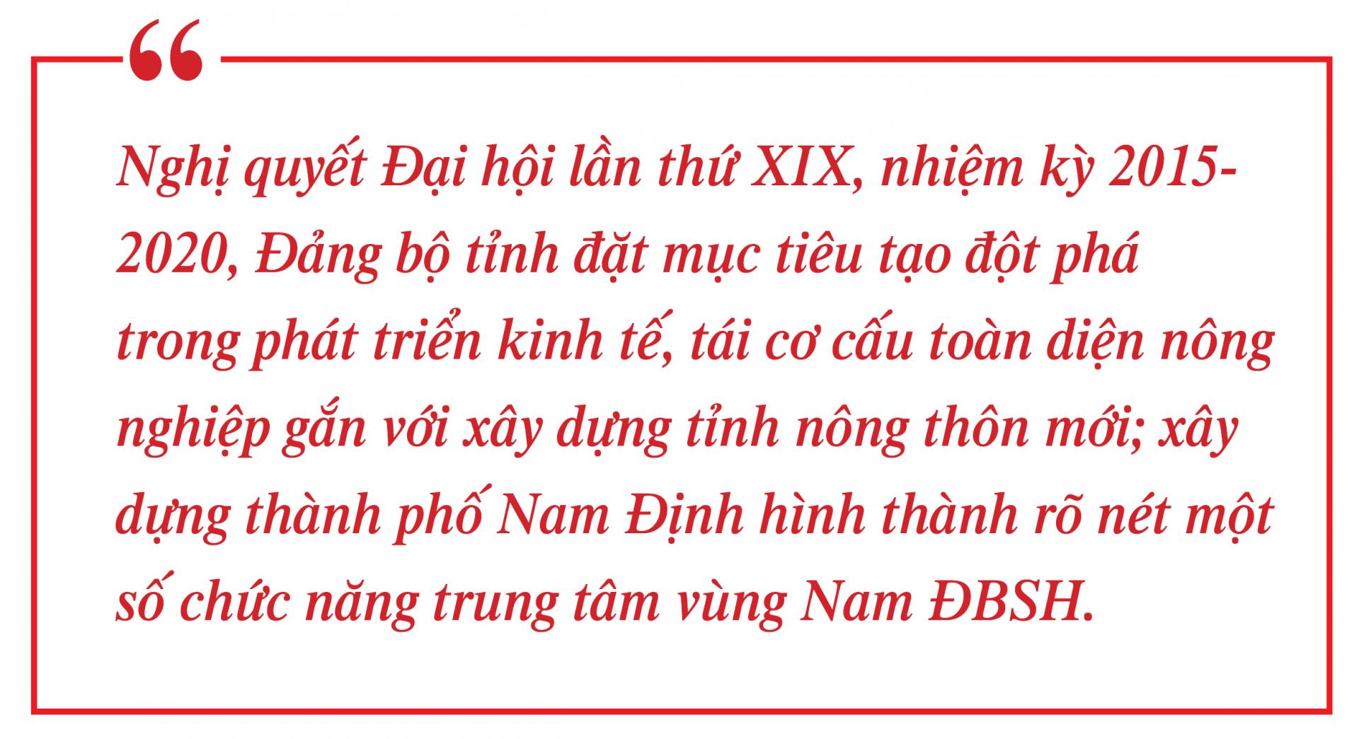 Nghị quyết Đại hội lần thứ XIX, nhiệm kỳ 2015-2020, Đảng bộ tỉnh đặt mục tiêu tạo đột phá trong phát triển kinh tế, tái cơ cấu toàn diện nông nghiệp gắn với xây dựng tỉnh nông thôn mới (NTM); xây dựng thành phố Nam Định hình thành rõ nét một số chức năng trung tâm vùng Nam ĐBSH. Cũng trong nhiệm kỳ này, tỉnh đã chú trọng nhiệm vụ khai thác kinh tế biển và phát triển vùng kinh tế biển. Mặc dù đã đạt những thành tựu đáng kể trong phát triển KT-XH của tỉnh, song sự đột phá về kinh tế đảm bảo cho phát triển tỉnh về lâu dài, bền vững vẫn chưa rõ nét. Thu hút đầu tư quy mô lớn chưa nhiều. Kinh tế tỉnh vẫn cần những "cú huých" để tạo đột phá tương xứng tiềm năng và kỳ vọng phát triển của tỉnh.