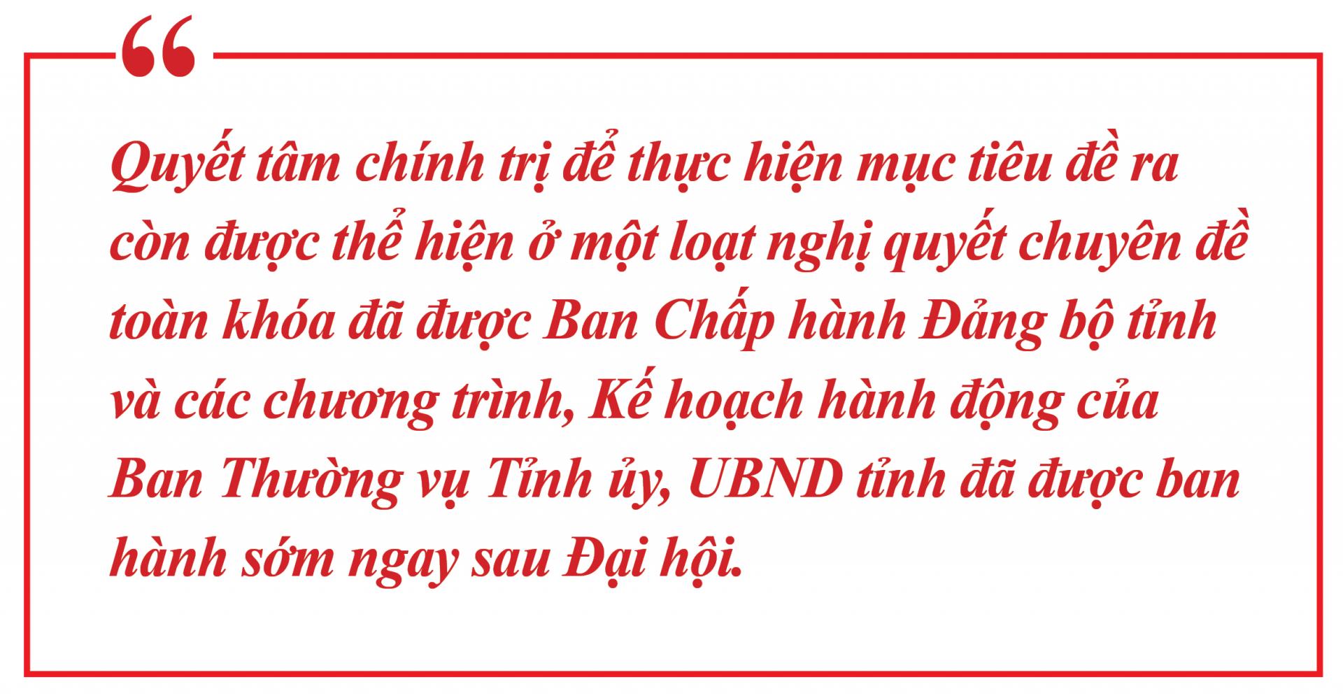 Quyết tâm chính trị để thực hiện mục tiêu đề ra còn được thể hiện ở một loạt nghị quyết chuyên đề toàn khóa đã được Ban Chấp hành Đảng bộ tỉnh và các chương trình, Kế hoạch hành động của Ban Thường vụ Tỉnh ủy, UBND tỉnh đã được ban hành sớm ngay sau Đại hội. Đó là Nghị quyết số 04-NQ/TU về đẩy mạnh cải cách hành chính, nâng cao năng lực cạnh tranh, xúc tiến và thu hút đầu tư giai đoạn 2021-2025; Nghị quyết số 05/NQ-TU về xây dựng, phát triển kinh tế ven biển tỉnh Nam Định giai đoạn 2021-2025 và những năm tiếp theo; Nghị quyết số 06/NQ-TU về xây dựng NTM nâng cao, kiểu mẫu giai đoạn 2021-2025; Nghị quyết số 07/NQ-TU về tập trung xây dựng và phát triển thành phố Nam Định giai đoạn 2021-2025; Nghị quyết chuyên đề số 09-NQ/TU, ngày 15-10-2021, về chuyển đổi số tỉnh Nam Định đến năm 2025, định hướng đến năm 2030.