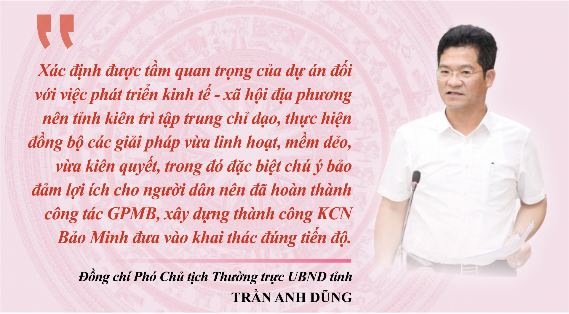 Bảo Minh (Vụ Bản) không phải là KCN đầu tiên của tỉnh nhưng là KCN đầu tiên đầu tư bằng nguồn vốn ngoài ngân sách Nhà nước, do doanh nghiệp thực hiện theo Quyết định số 1107 ngày 21-8-2006 của Thủ tướng Chính phủ. Do vậy, quá trình triển khai dự án ban đầu, nhất là công tác giải phóng mặt bằng (GPMB) khá phức tạp. Đồng chí Trần Anh Dũng, Ủy viên Ban TVTU, Phó Chủ tịch Thường trực UBND tỉnh nhớ lại: “Xác định được tầm quan trọng của dự án đối với việc phát triển kinh tế - xã hội địa phương nên tỉnh kiên trì tập trung chỉ đạo, thực hiện đồng bộ các giải pháp vừa linh hoạt, mềm dẻo, vừa kiên quyết, trong đó đặc biệt chú ý bảo đảm lợi ích cho người dân nên đã hoàn thành công tác GPMB, xây dựng thành công KCN Bảo Minh đưa vào khai thác đúng tiến độ”.