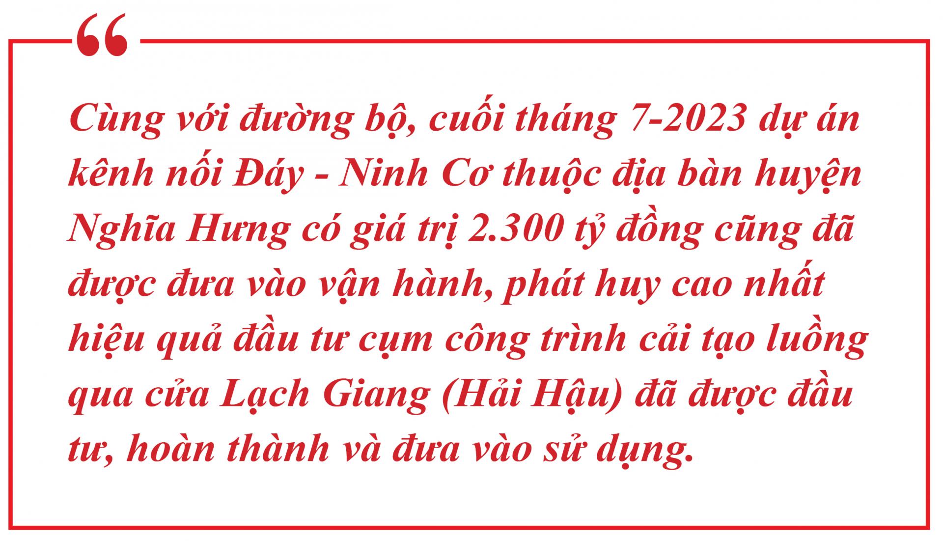 Cùng với đường bộ, cuối tháng 7-2023 dự án kênh nối Đáy - Ninh Cơ thuộc địa bàn huyện Nghĩa Hưng có giá trị 2.300 tỷ đồng cũng đã được đưa vào vận hành, phát huy cao nhất hiệu quả đầu tư cụm công trình cải tạo luồng qua cửa Lạch Giang (Hải Hậu) đã được đầu tư, hoàn thành và đưa vào sử dụng từ năm 2016. Công trình chính của dự án là âu tàu vận hành tương tự như kênh đào nổi tiếng thế giới Panama, có quy mô lớn nhất được xây dựng tại Việt Nam hiện nay. Công trình đã kết nối tuyến vận tải thủy ven biển phía Bắc với các cảng thủy trên sông Đáy khu vực Nam Định, Ninh Bình qua cửa biển Lạch Giang; tàu chở container tải trọng 2.000 tấn đầy tải và 3.000 tấn giảm tải có thể đi qua, thay vì phải đi vòng ra cảng Hải Phòng và di chuyển tiếp bằng đường bộ như trước kia; giúp rút ngắn về thời gian 5 tiếng trong hành trình di chuyển từ các tỉnh ven biển đến Ninh Bình và ngược lại so với trước kia. Luồng đường thủy này có vai trò "cú huých" lớn với kinh tế biển, trong đó có vận tải biển tại khu vực Nam Định nói riêng và vùng kinh tế đồng bằng Bắc Bộ khởi sắc với dự báo sản lượng hàng hoá vận chuyển sắp tới sẽ tăng nhanh khi tỉnh đang đón làn sóng đầu tư lớn với loạt doanh nghiệp, dự án FDI.