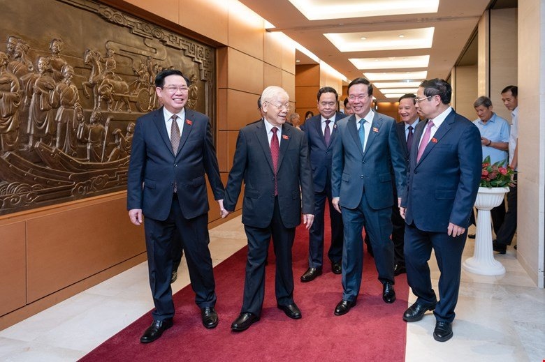 | Tổng Bí thư Nguyễn Phú Trọng, Chủ tịch nước Võ Văn Thưởng, Thủ tướng Phạm Minh Chính, Chủ tịch Quốc hội Vương Đình Huệ và các đại biểu dự Kỳ họp thứ 5 Quốc hội khóa XV. |